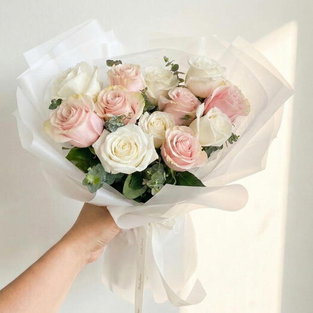 Eucalyptus - 2 pcs rose white - 6 pcs rose candy giri - 6 pcs