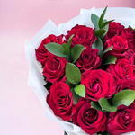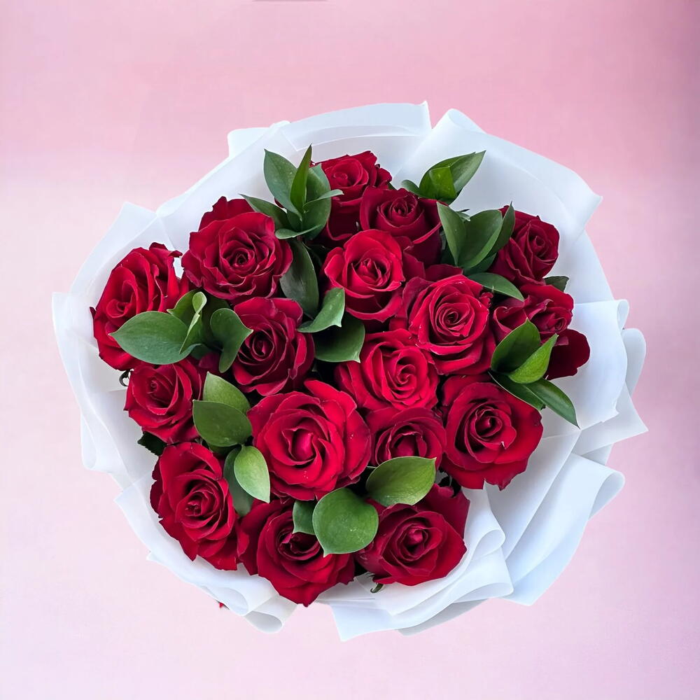 Indulge in the timeless charm of our stunning floral arrangement, featuring 17 luscious red roses and 8 sprigs of verdant ruscus. Perfect for enhancing any interior with a touch of natural beauty, this bouquet captures an exquisite balance of color and texture. The vibrant roses exude passionate grandeur, while the dark green ruscus provides a stunning contrast, making this arrangement an eye-catching centerpiece that can add serenity and elegance to your space. A stunning choice for both personal and professional settings.