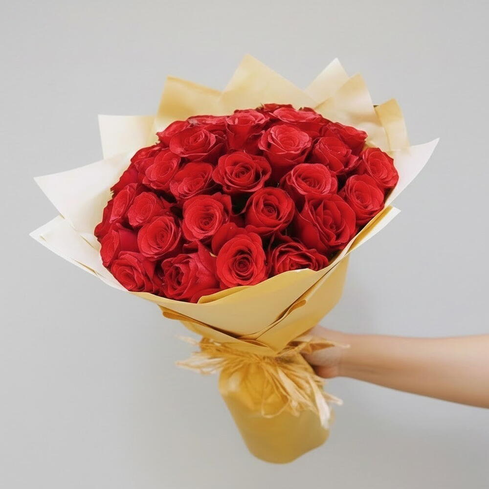 This elegant bouquet of classic red roses is a timeless symbol of love, passion, and deep emotion. Rich crimson blooms are gathered into a lush, rounded arrangement and wrapped in kraft paper that adds warmth and sophistication. The bouquet looks luxurious yet refined, making it a perfect choice for romantic occasions, anniversaries, or meaningful celebrations. Fresh roses fill the arrangement with natural beauty and a subtle floral fragrance. To keep the bouquet looking its best, trim the stems slightly before placing them in clean water. Change the water daily and keep the flowers away from direct sunlight and heat sources. With proper care, the roses will remain fresh and vibrant for many days.
