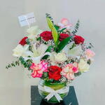 Red rose - 5 pcs Eucalyptus - 3 pcs Pink rose - 5 pcs White rose - 5 pcs lily white - 2 pcs babys-breath - 3 pcs