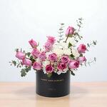 Purple roses symbolize enchantment and admiration, while white hydrangeas and carnations reflect purity and devotion. Beautifully presented in a large round box embossed with “Happy Anniversary”, this bloom box is a romantic gift that speaks volumes.