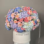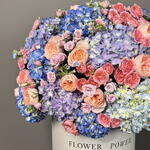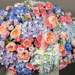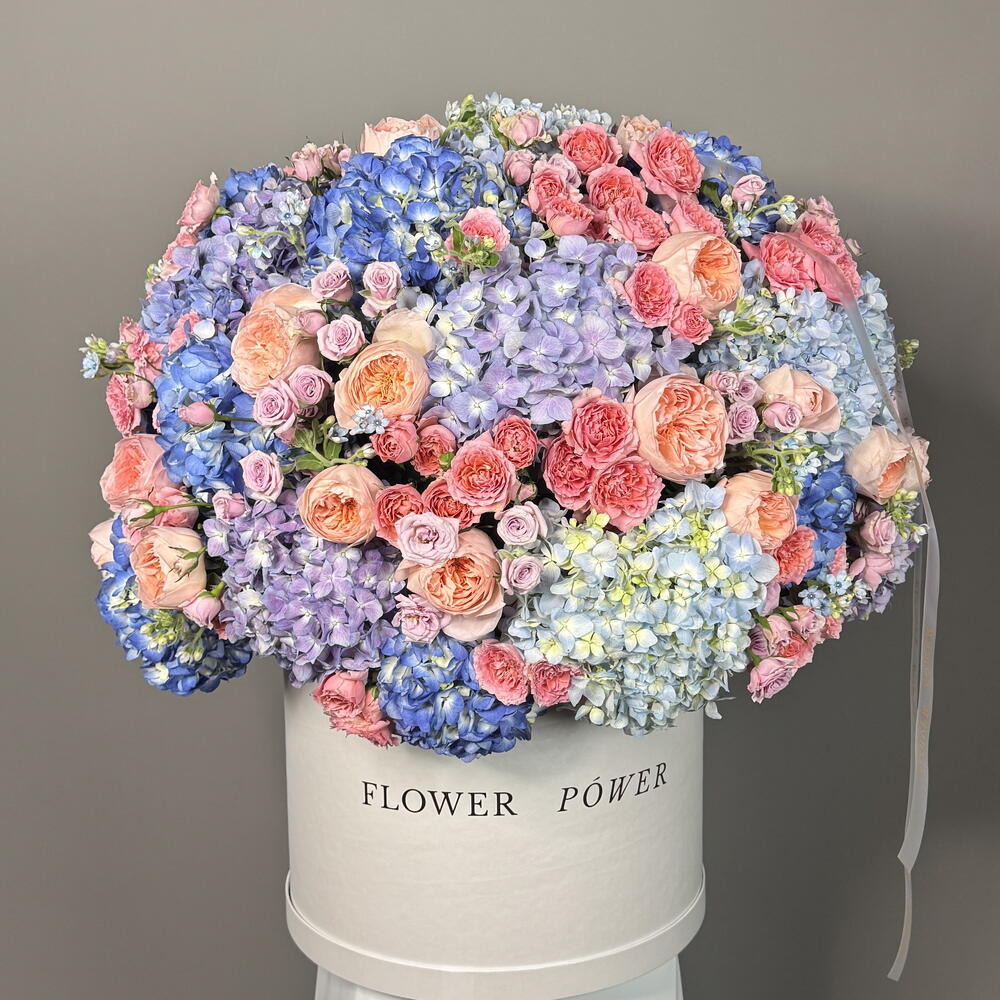 Royal Bloom is a majestic explosion of color, featuring premium hydrangeas, garden roses, spray roses, and oxypetalum in a luxurious white hatbox. Shades of royal blue, peach, lavender, and soft pink create a breathtaking arrangement perfect for anniversaries, weddings, or grand celebrations. Ideal for searches like luxury flower box Dubai and royal bouquet delivery UAE. Comes with same-day express delivery across Dubai.