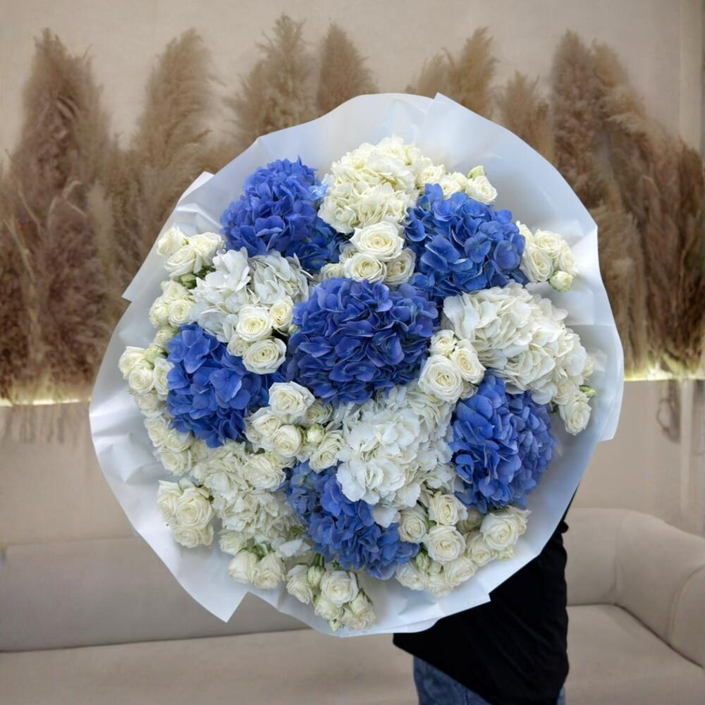 Express your love this Valentine’s Day with a fresh and elegant bouquet featuring 6 blue hydrangeas, 6 white hydrangeas, and 15 white spray roses. This stunning combination of soft blues and pure whites creates a luxurious, romantic gift that conveys love, purity, and heartfelt emotions.