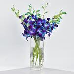 Product Details: 6 stems blue orchid. 2-3 stems green parvifolia leaves. Tied with blue grosgrain ribbon. Beautifully Handcrafted On A 20x10.5 Cm floral Glass Vase Height: 20 cm Diameter: 10.5 cm