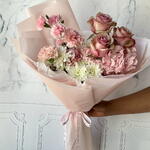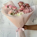pistachia leaf - 1 pcs wrapping small - 1 pcs chrysanthemum spray pinacolada - 3 pcs hydrangea dream pink - 1 pcs hydrangea bloom pink - 1 pcs rose mix l50 - 3 pcs carnation spray giana - 2 pcs