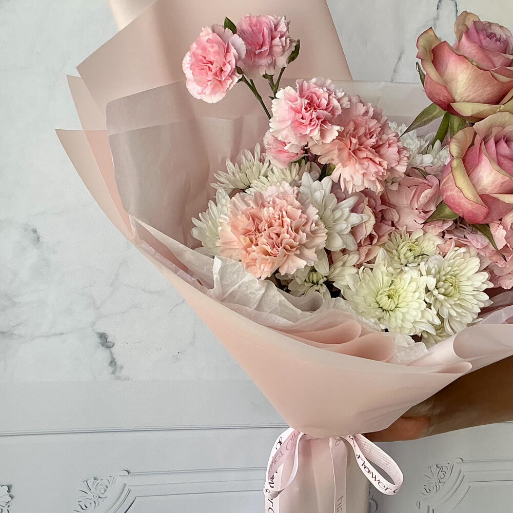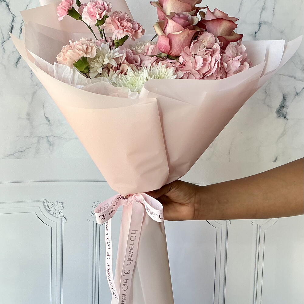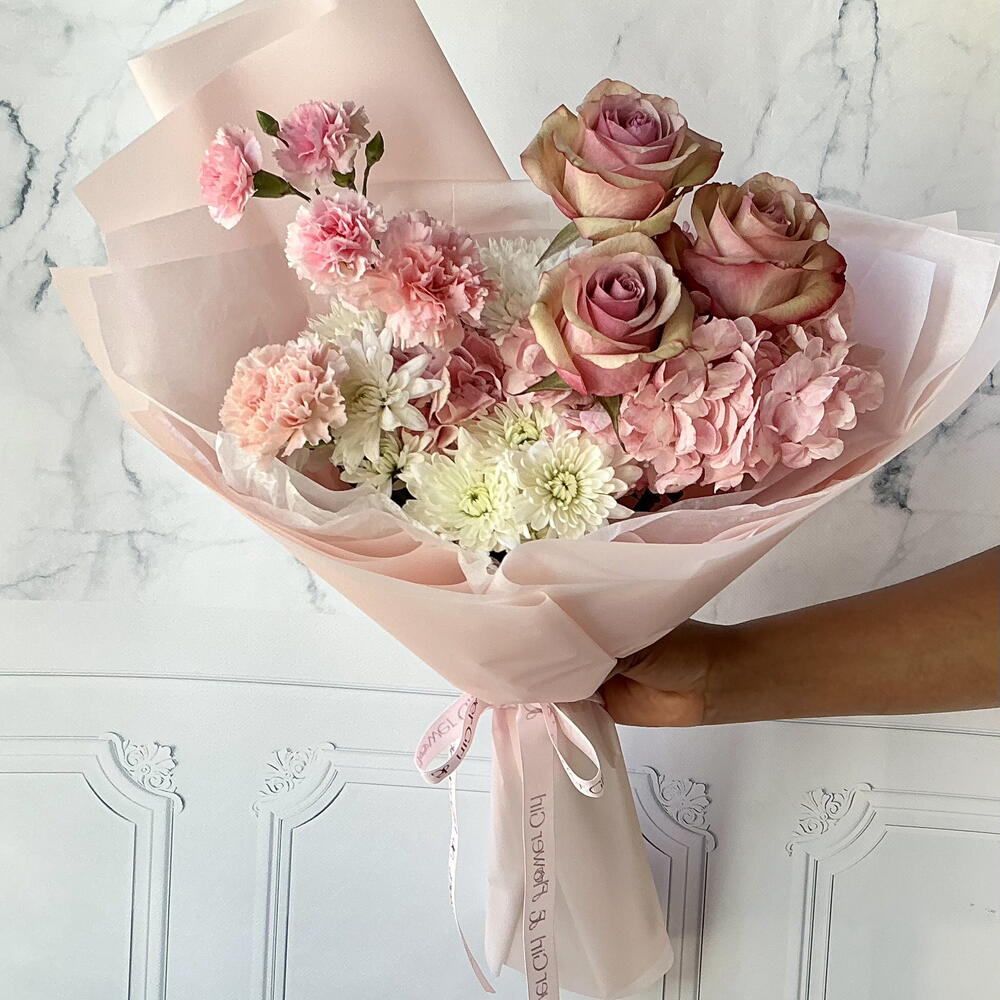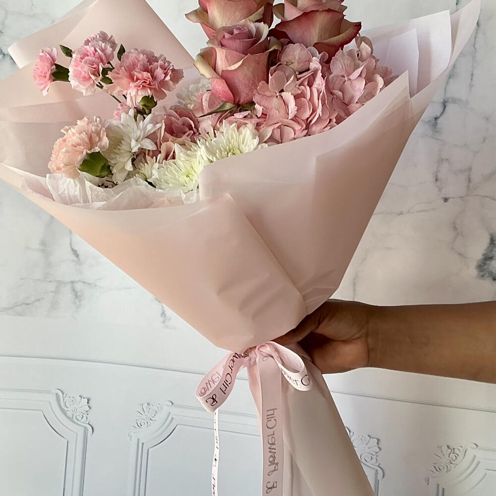 pistachia leaf - 1 pcs wrapping small - 1 pcs chrysanthemum spray pinacolada - 3 pcs hydrangea dream pink - 1 pcs hydrangea bloom pink - 1 pcs rose mix l50 - 3 pcs carnation spray giana - 2 pcs