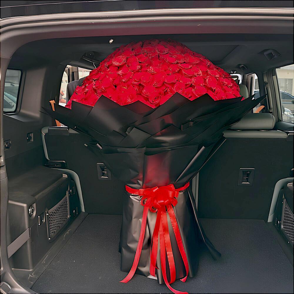 An awe-inspiring masterpiece of 500 vibrant red roses, beautifully wrapped in sleek black paper with elegant red ribbon accents. Perfect for grand celebrations, this bouquet symbolizes love, passion, and unforgettable moments
