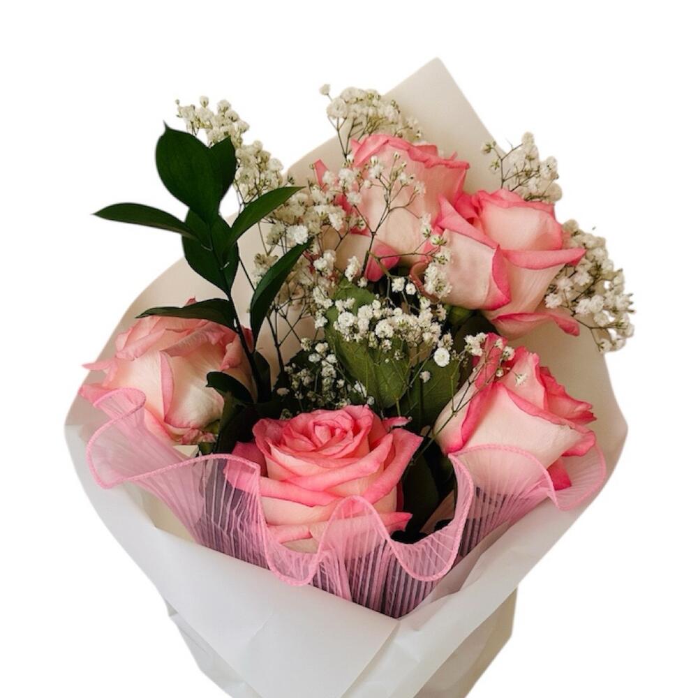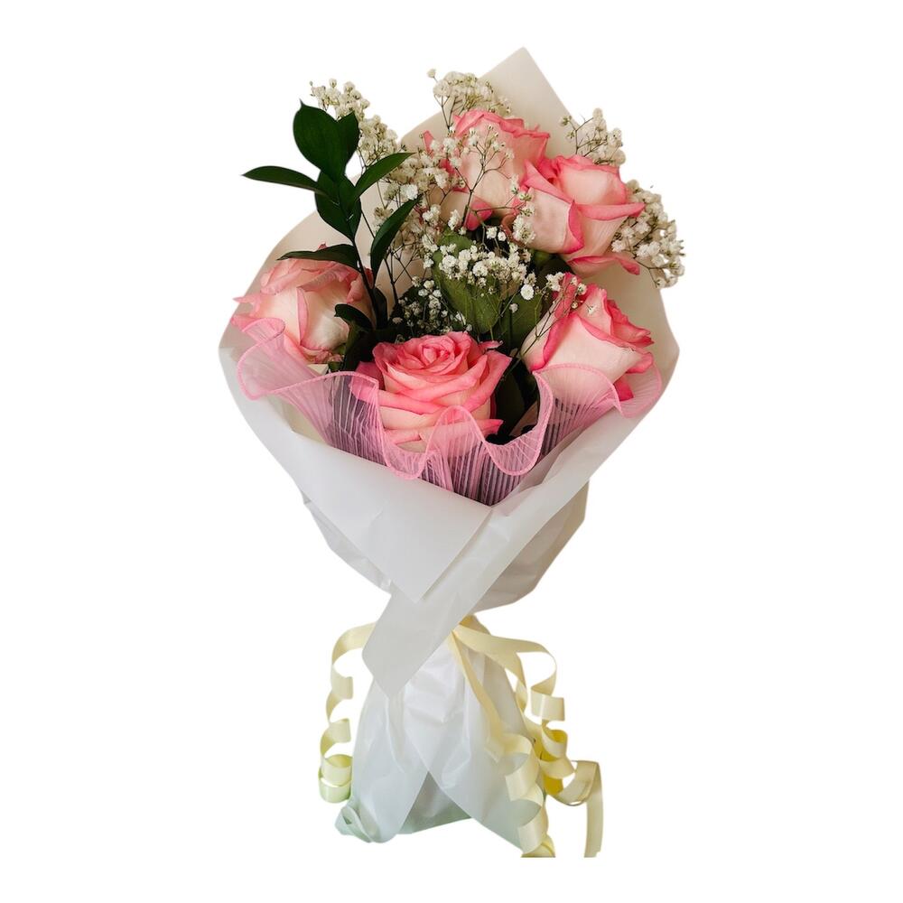 💐 Includes: • 5 Premium Pink Roses • 3 Stem Gypsum • Classic White Wrap With Cute Pink Net • Vanilla Cream Colored Satin Ribbon • Free Personalized Card (IN ENGLISH) ❤️ Ideal for: Anniversary | Gift | Just Because | Special Moments |