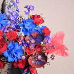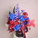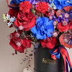 Red rose - 8 pcs Ribbon - 2 pcs Astrantia - 5 pcs Iris - 5 pcs flower box - 1 pcs carnation - 5 pcs blue rose - 5 pcs oxypetalum - 3 pcs delphinium - 3 pcs feathers red - 3 pcs feathers black - 2 pcs anthurrium - 3 pcs