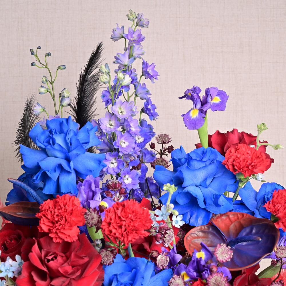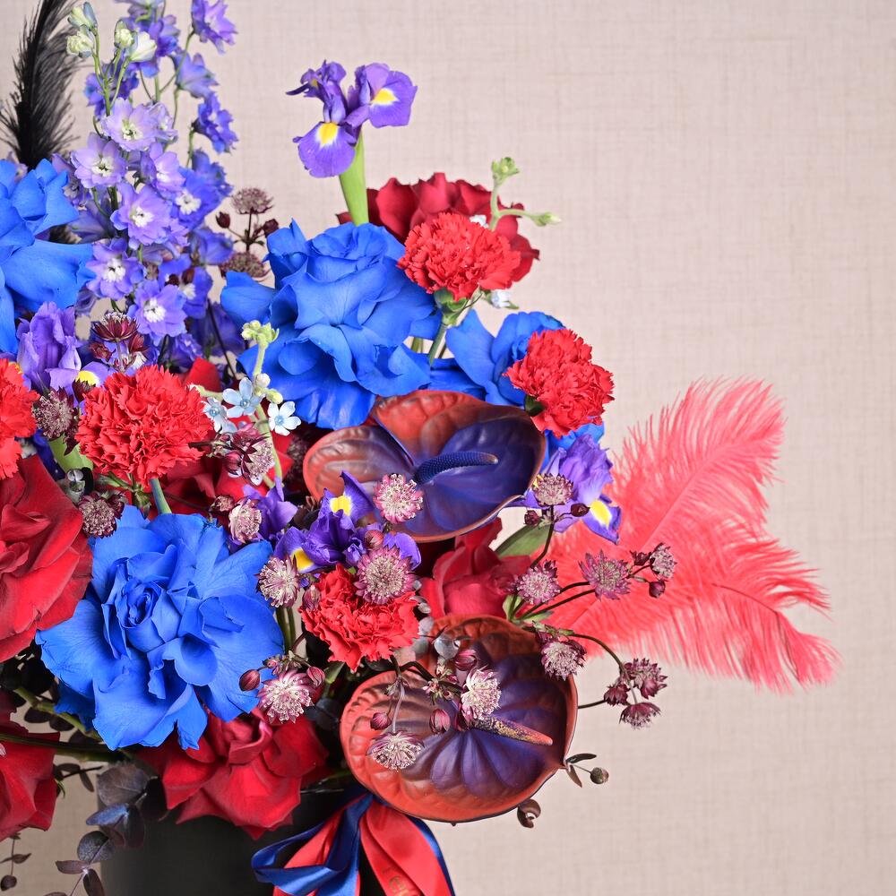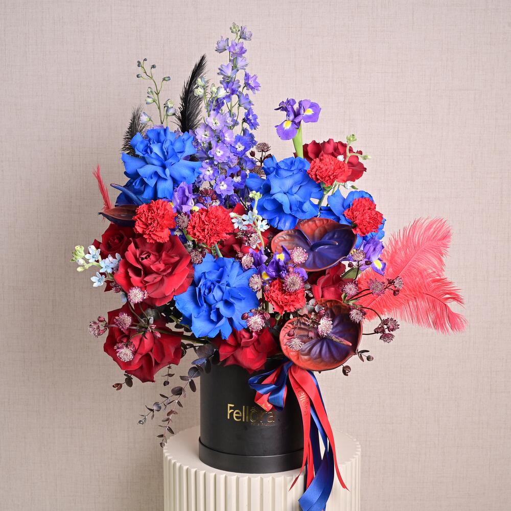 A bold mix of red roses, blue roses, carnations, anthuriums, delphinium, iris, and accent feathers in a premium black bloom box. Designed for impactful corporate gifts, grand openings, and statement displays.