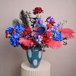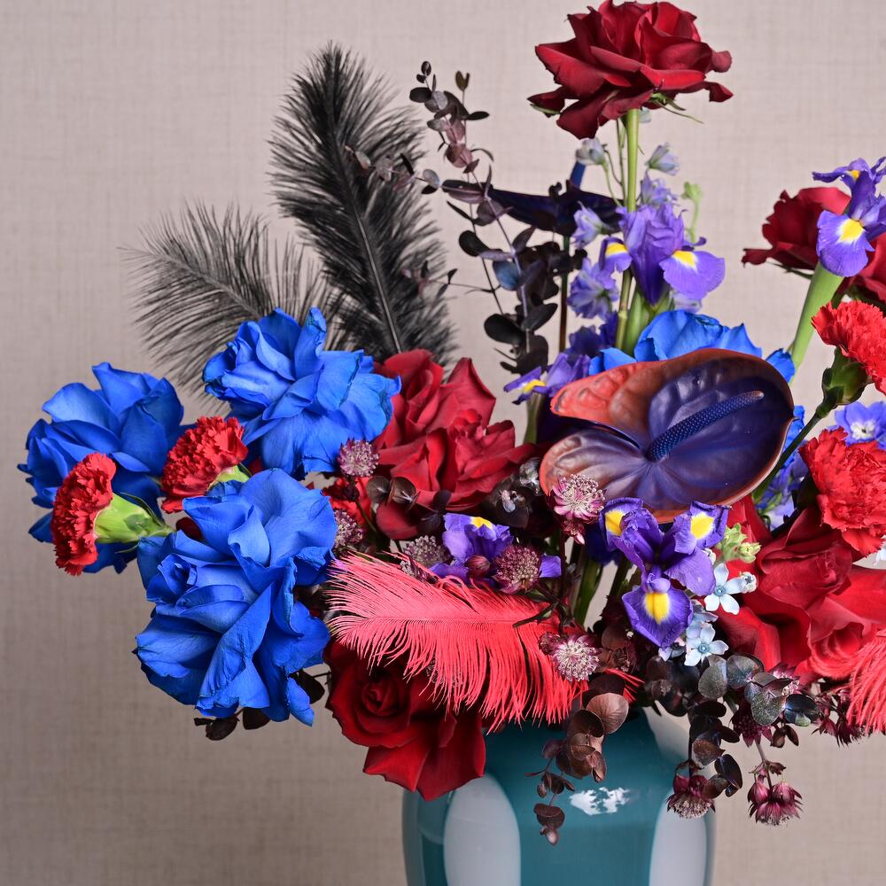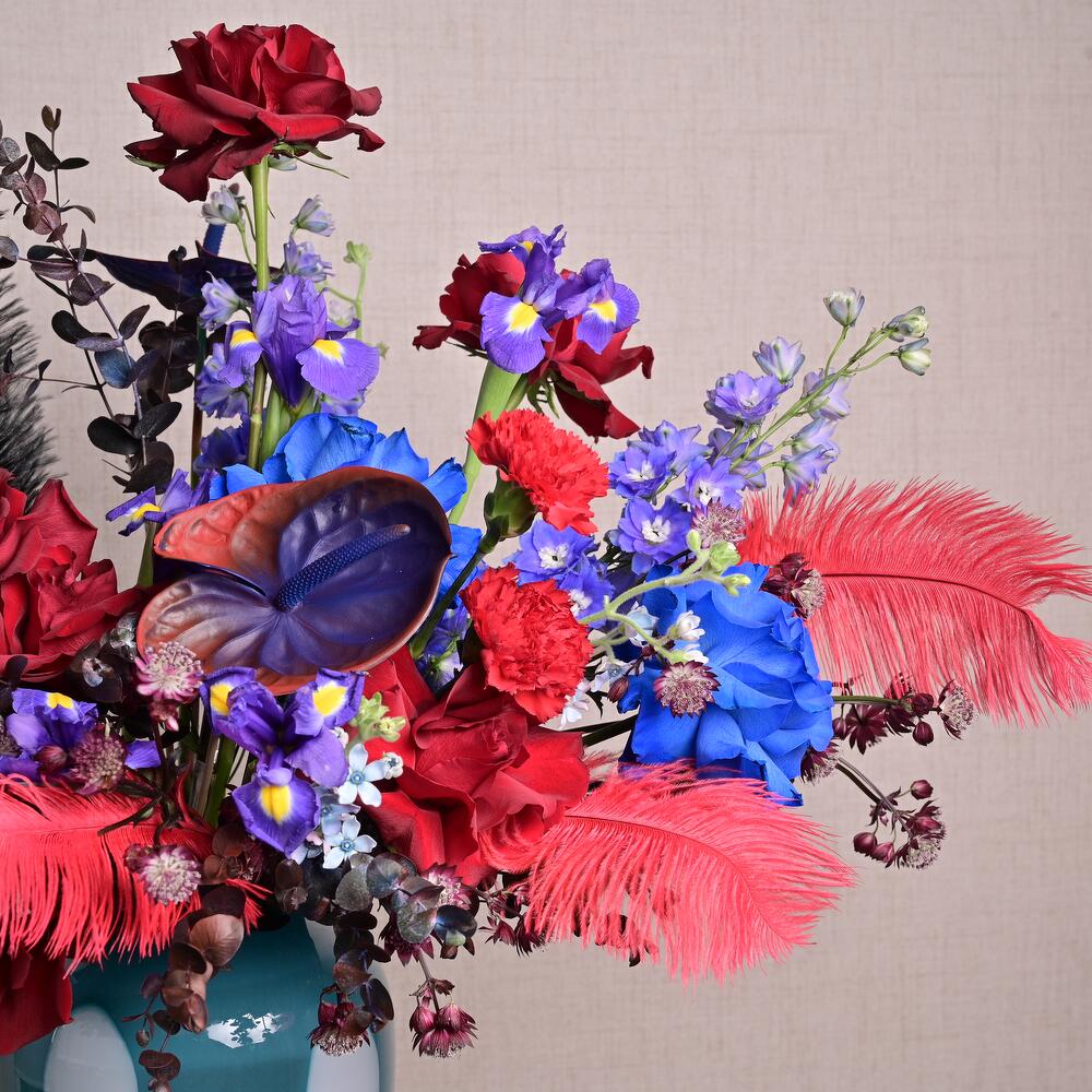 Red rose - 8 pcs Astrantia - 5 pcs Eucalyptus - 5 pcs Iris - 5 pcs Anthurium - 3 pcs carnation - 5 pcs blue rose - 5 pcs oxypetalum - 3 pcs delphinium - 3 pcs feathers red - 3 pcs feathers black - 2 pcs blue glass vase - 1 pcs