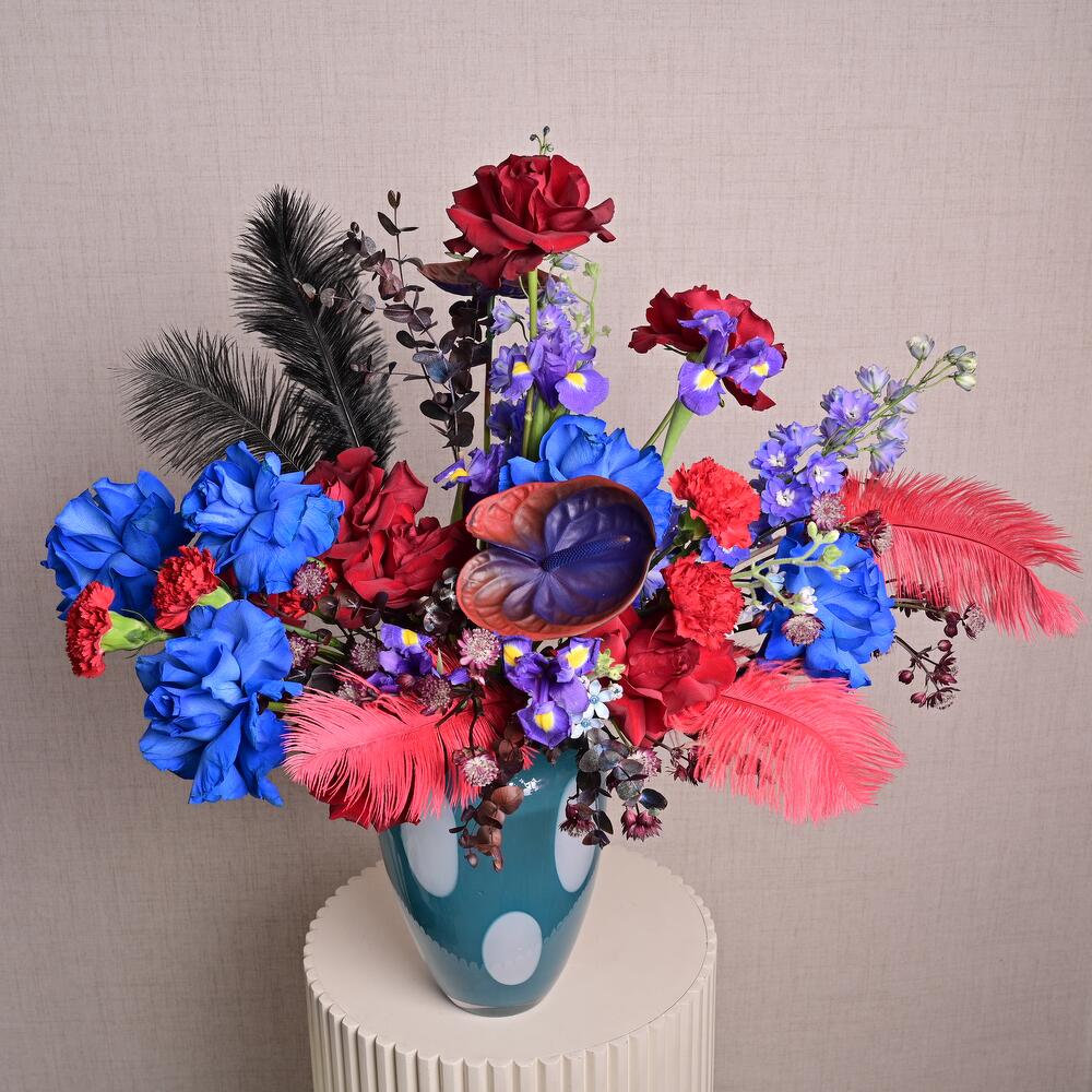 A striking combination of red roses, blue roses, carnations, anthuriums, iris, delphinium, astrantia, and oxypetalum, finished with black and red feathers in a polka dot blue glass vase.
