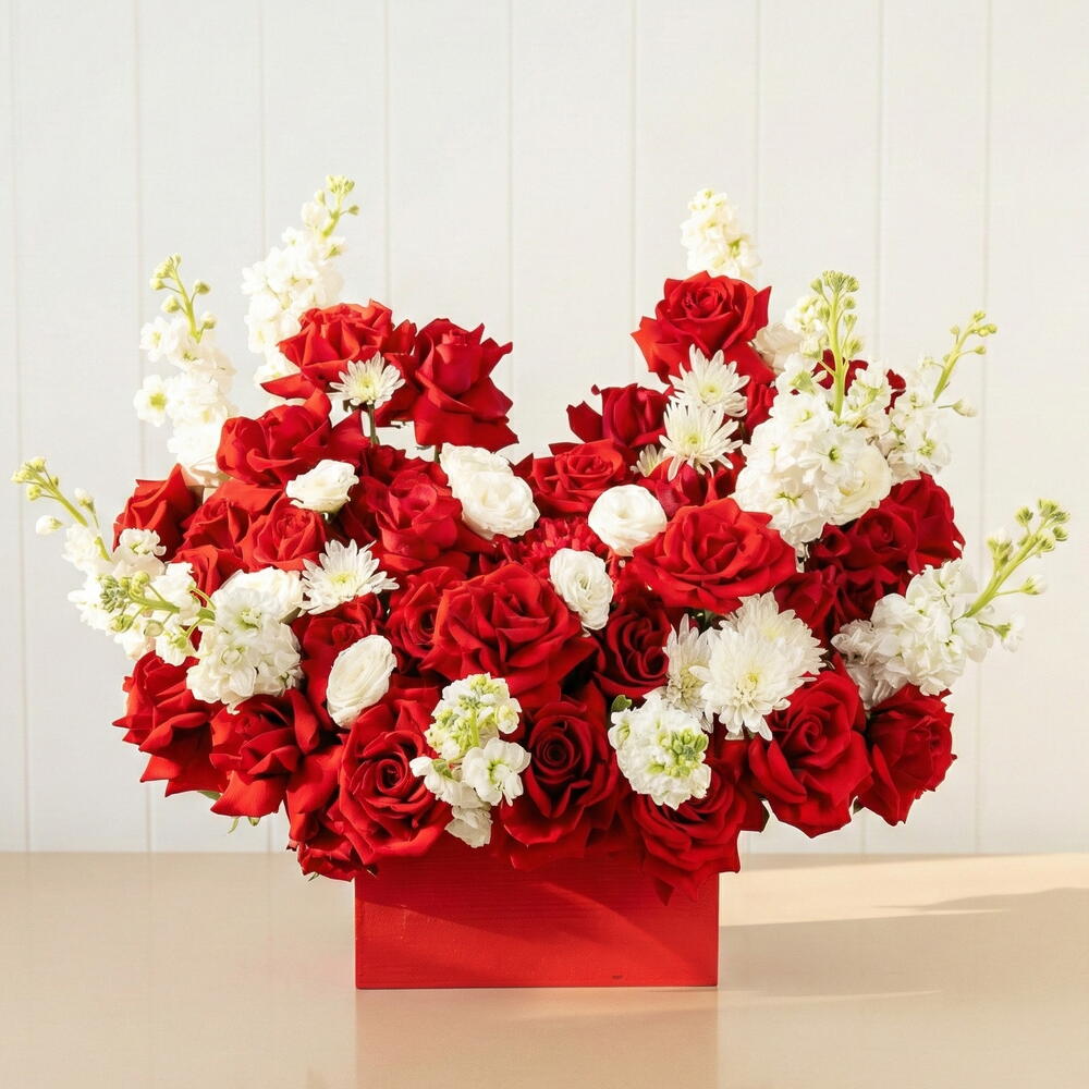 This regal bouquet of red roses, white florals, and rich greenery is the epitome of elegance and splendor. Premium Ecuador Red Rose (36 pcs), Matthiola White (11 pcs), Hydrangea Red (1 pcs), Lisanthus White (3 pcs), Blad Pistachio (3 pcs), Chrysanthemum Pina Colda (2 pcs) tags: royal bouquet Dubai, red and white flower box, luxury gift arrangement