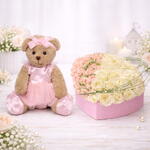 teddy - 15 cm white rose stems - 20 pcs fresh baby pink rose stems - 2 pcs heart shape pink box - 1 pcs