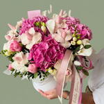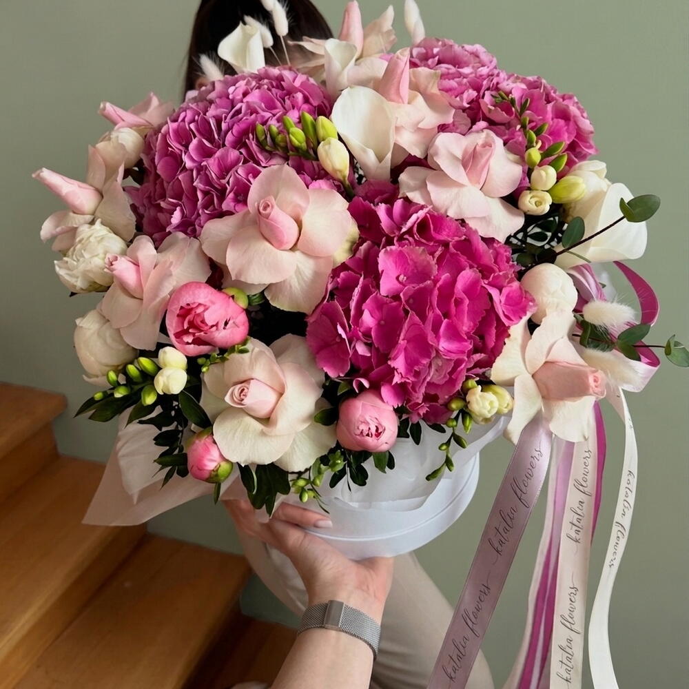 Ribbon - 3 pcs white box - 1 pcs fuchsia hydrangea - 3 pcs white calla lilies - 5 pcs light pink roses - 10 pcs cream freesia buds - 9 pcs green eucalyptus leaves - 10 pcs white bunny tail (lagurus) - 5 pcs