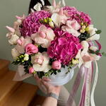 For faster service and more details, contact us via Instagram. Discover a world of beauty and elegance with this exquisite floral box, uniquely designed to captivate every gaze. Comprising of 3 enchanting Fuchsia Hydrangeas, 10 blush Light Pink Roses, and 9 delicate Cream Freesia Buds, each flower exudes elegance, passion, and sophistication. Added to the mix are 5 pristine White Calla Lilies standing out in their regal glory, and 10 fresh Green Eucalyptus leaves, providing a lush green backdrop. The arrangement is further enhanced with 5 soft White Bunny Tails (Lagurus) adding a touch of whimsy, all elegantly arranged in 1 white box. To complete this perfect gift, the box is dressed in 3 tasteful ribbons that add an extra touch of charm. This floral masterpiece is the quintessence of grace and beauty, designed to delight any recipient.
