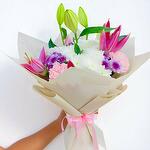single ruscus - 10 pcs lily pink - 3 pcs gypso white - 1 pcs mix chrysanthemum - 6 pcs lite pink pepar - 4 pcs