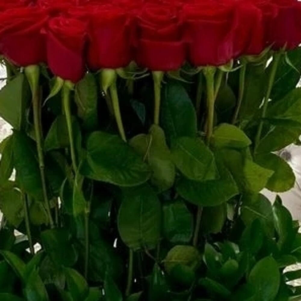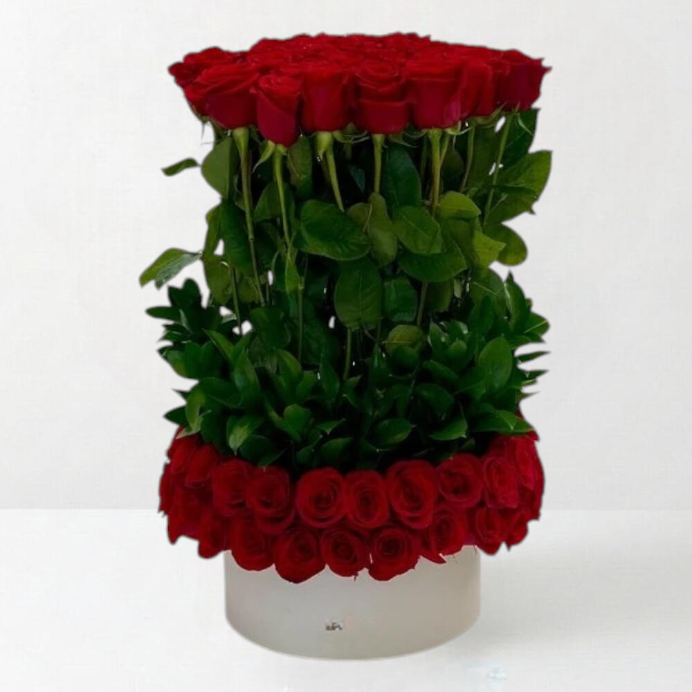 Tower, Regal Rose Tower, or a tall red roses arrangement. The arrangement is a tiered, grand display featuring numerous deep red, long-stemmed roses that stand upright, often supported by floral foam or a hidden structure within a container. Lush green foliage (like ruscus or leatherleaf fern) is typically interspersed among the blooms and lines the base, providing a striking contrast to the rich crimson petals. The roses symbolize deep love, passion, and respect, making this a popular choice for significant romantic occasions, anniversaries, or proposals.