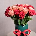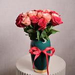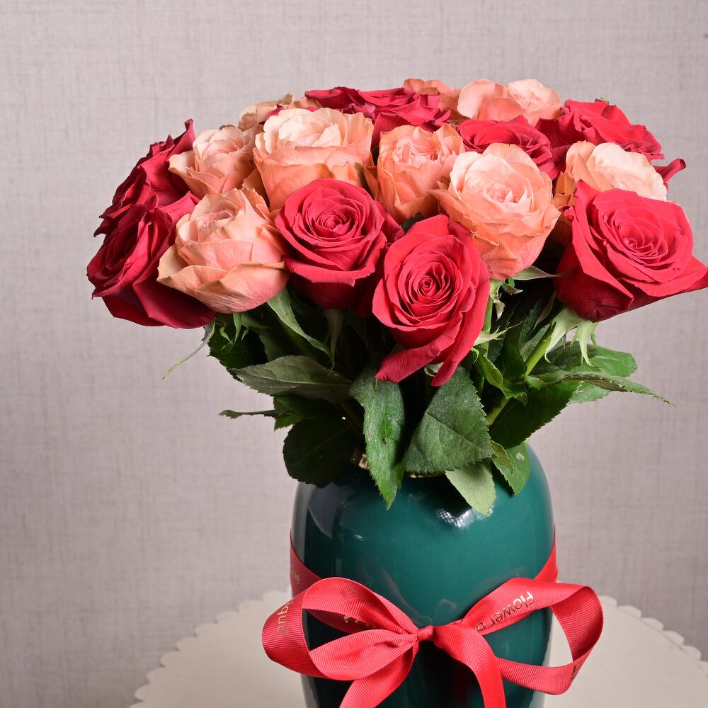 Ribbon - 1 pcs red roses - 13 pcs royal teal ceramic vase - 1 pcs kahala (kouki) roses - 12 pcs