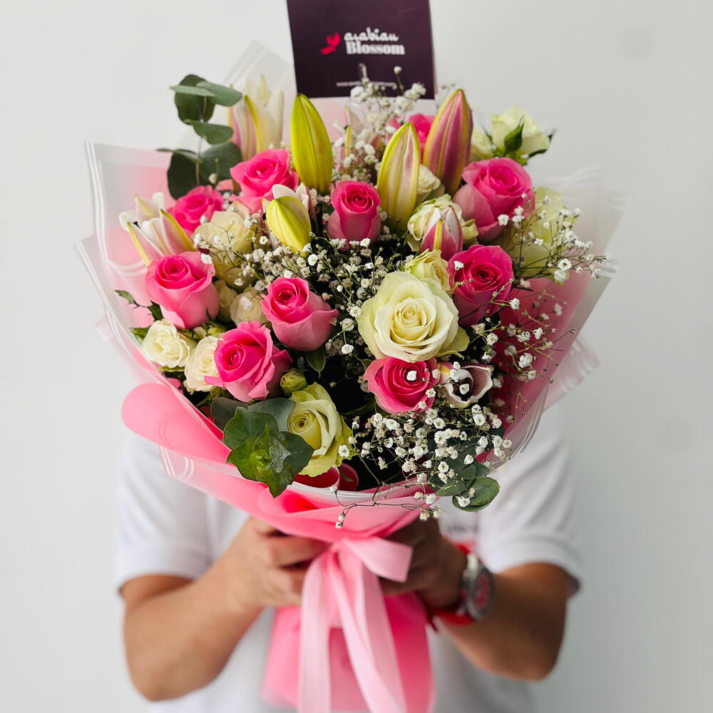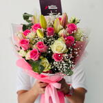 Bouquet of 5 white rose, 10 pink rose, 3 pink lilies with fillers in a nice wrapping (Facing). Elegant bouquet of 5 white roses, 10 pink roses, and 3 pink lilies with delicate fillers, beautifully wrapped for a graceful look. A perfect floral gift to convey love, admiration, and elegance on special occasions. mixed rose and lily bouquet, pink and white flowers, elegant floral arrangement, fresh flower delivery. Trim stems and place in clean water, keeping the bouquet away from direct sunlight and heat. Change water daily and remove wilted petals to maintain freshness.