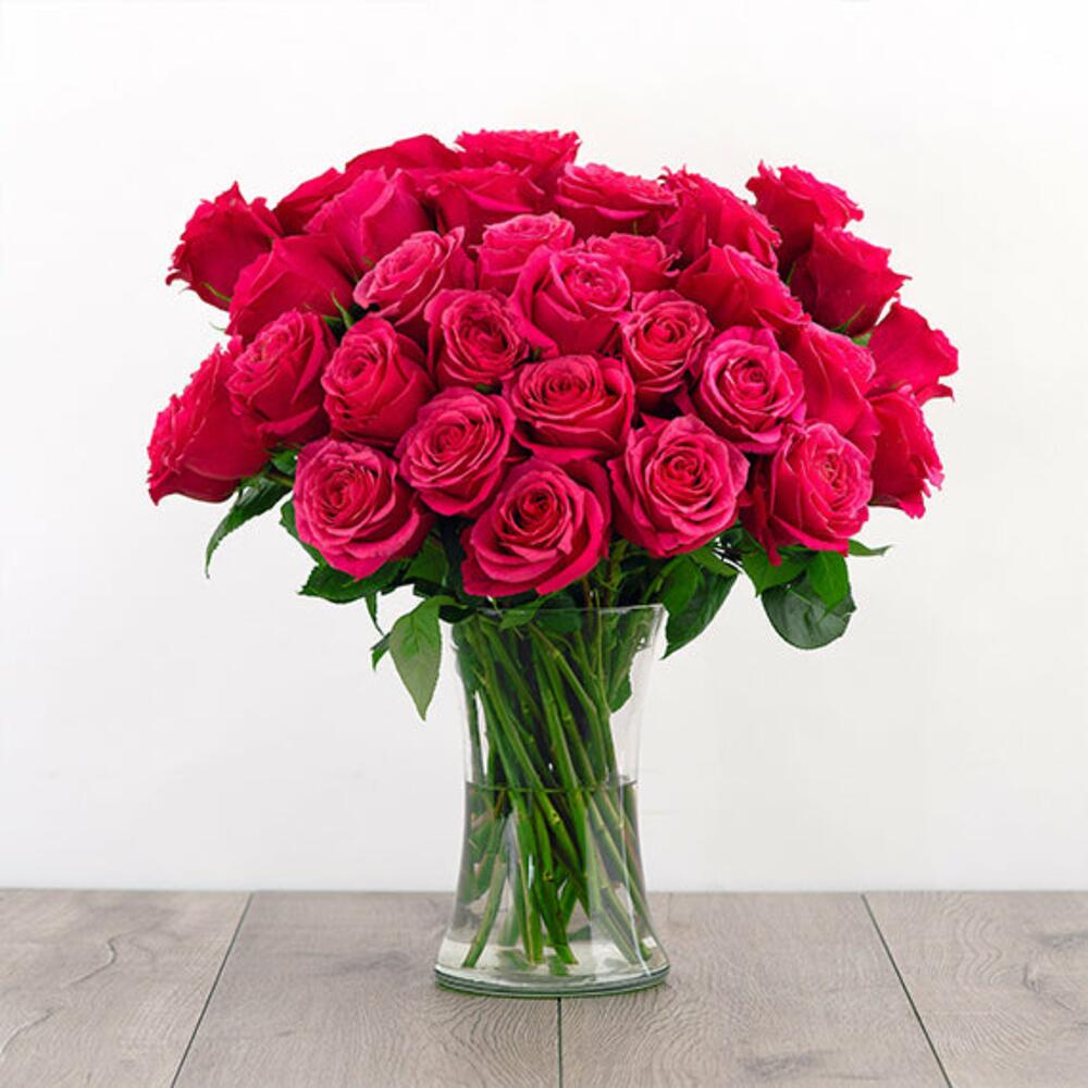 A fantastic Clear glass vase arrangement of 24 dark pink roses. Send this vase arrangement today to brings a smile and happiness to your loved one's