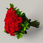 A luxurious bouquet of vibrant red roses, artfully arranged to create a cascading effect, accented with lush green leaves. The stems are neatly bound, emphasizing the rich, passionate beauty of the roses.