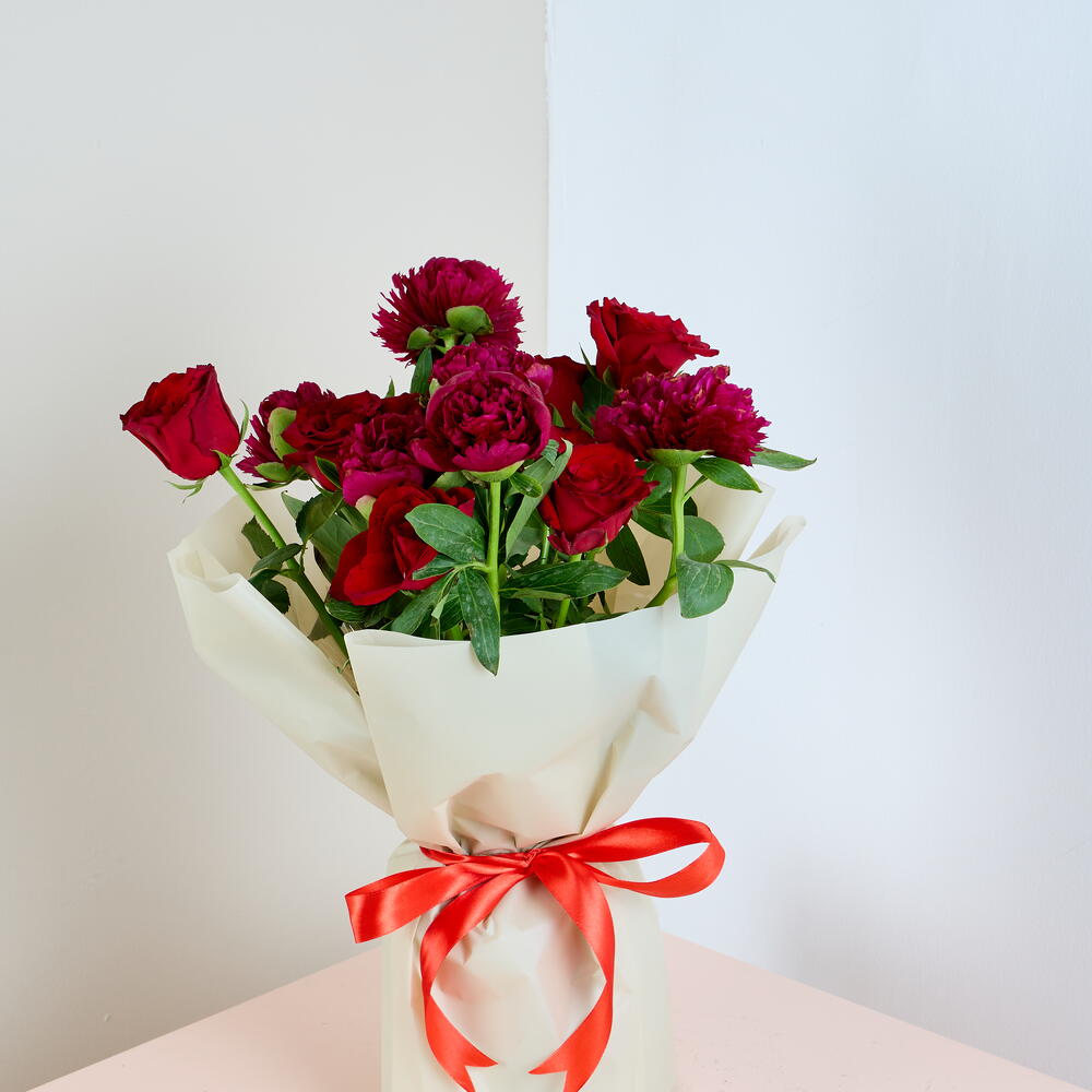 Bold and beautiful, this striking bouquet features deep red roses and rich crimson blooms wrapped in elegant white paper, finished with a luxurious red satin ribbon. The perfect symbol of love, passion, and admiration, it’s an ideal gift for anniversaries, romantic gestures, or to simply make a grand statement. A stunning display of affection that speaks volumes without saying a word. Gift Details: Roses Peony