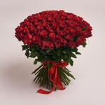 The bouquet is a lush, round masterpiece of deep‑red roses packed tightly together, forming a velvet‑soft, eye‑catching sphere. The roses are perfectly formed with rich, glossy petals that glow against the dark green, glossy leaves that frame and accentuate the floral mass. The stems are neatly gathered and tied with a bright red satin ribbon that bows elegantly at the base, adding a sleek, luxurious finish to the arrangement. The overall look is classic, romantic, and ultra‑polished, making the bouquet feel like a dramatic, high‑impact floral statement.