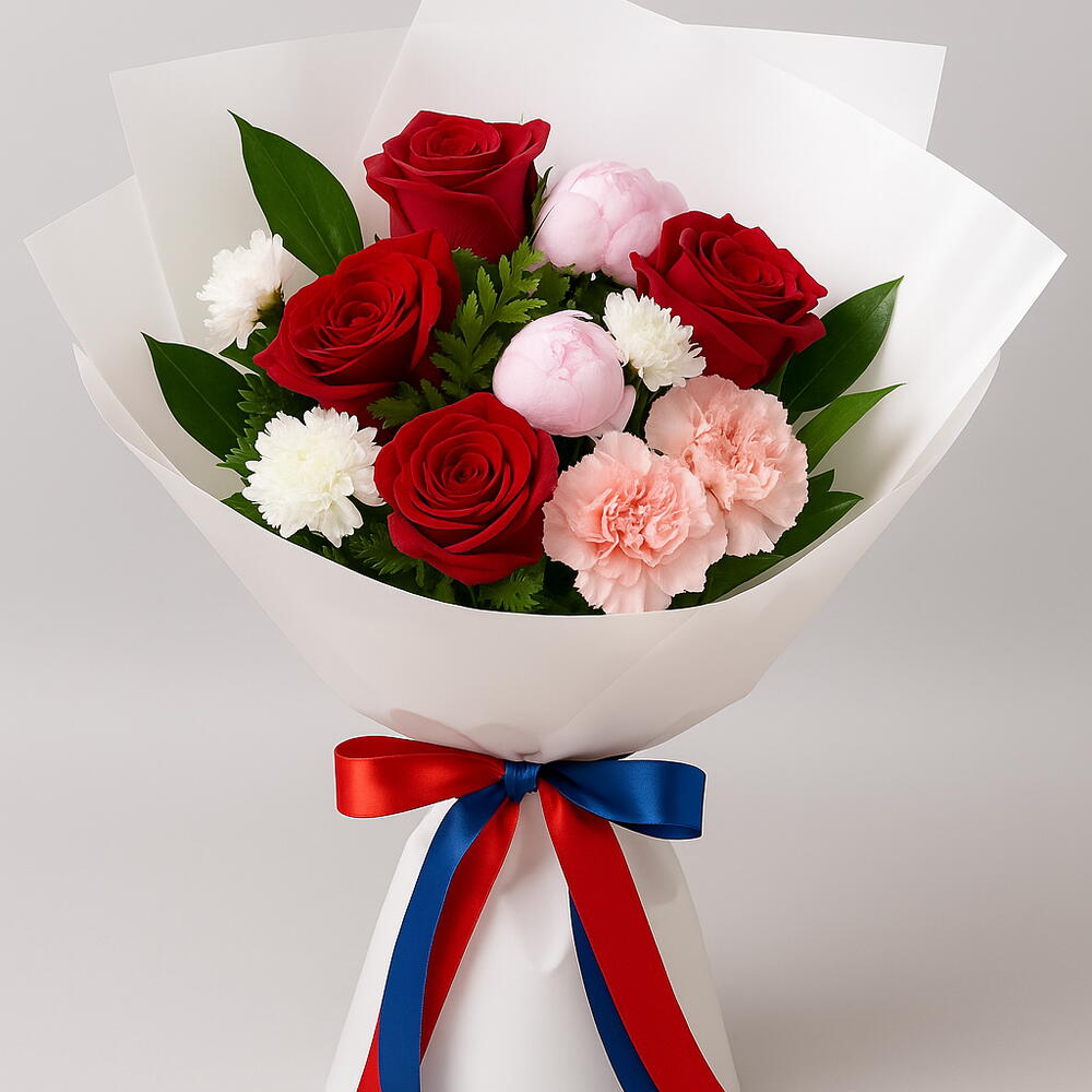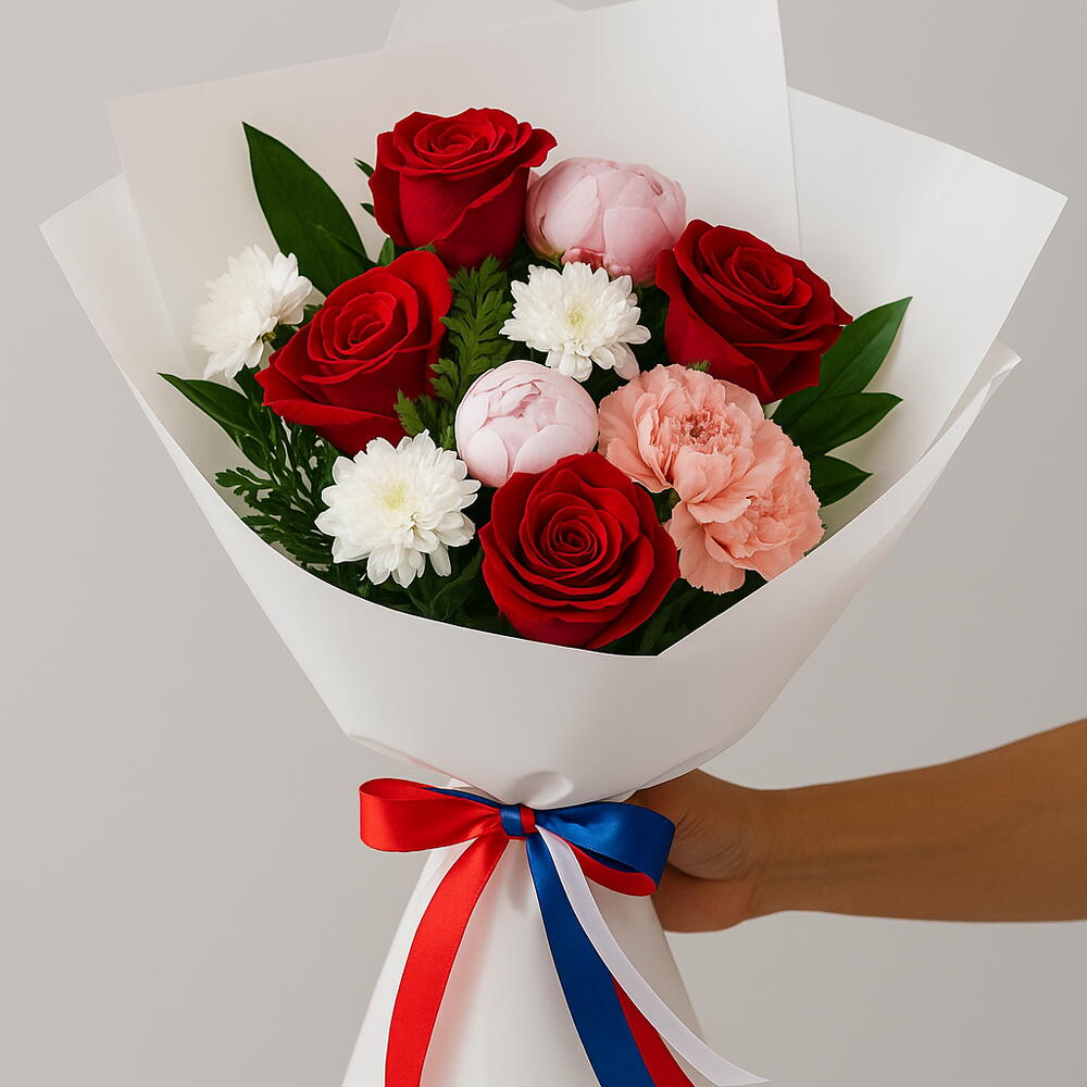 A charming and elegant bouquet that speaks the language of love, grace, and timeless beauty through its harmonious blend of colours and textures. This captivating arrangement features 4 classic red roses, representing passion and affection, paired with 2 delicate pink peonies, symbolizing luxury and romance. To enhance the bouquet’s soft charm, 2 pink carnations add warmth and admiration, while 2 white chrysanthemums bring purity and balance. The addition of 5 stems of fresh ruscus adds lush greenery and depth, giving the bouquet fullness and structure. Wrapped in 3 layers of premium white paper and tied with a luxurious 40×50 satin ribbon, the presentation feels modern, refined, and effortlessly sophisticated. Perfect for birthdays, anniversaries, thank-you gestures, or romantic surprises, this bouquet expresses emotion with style and elegance. ✓ 4 red roses, 2 pink peonies, 2 pink carnations, 2 white chrysanthemums ✓ 5 ruscus stems for greenery and depth ✓ Wrapped in 3 layers of premium white paper (40×50 ribbon tie) ✓ Symbolizes love, grace beauty ✓ Ideal for romantic gifting, celebrations, or heartfelt gestures ✓ Same-day delivery available across Dubai JVC “Celebrate love and grace — order your Red Roses Pink Peonies Bouquet today!” “Gift elegance that speaks from the heart — shop this romantic floral arrangement now!” “Make their day unforgettable — send this luxurious mixed bouquet today!”