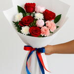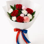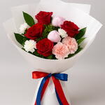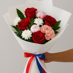 Red rose - 4 pcs Ruscus - 5 pcs pink carnation - 2 pcs pink peony - 2 pcs wrapping paper - 3 pcs