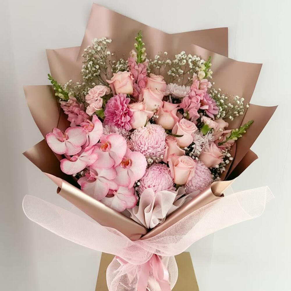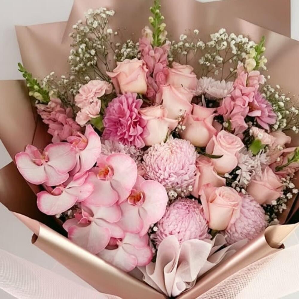 Snapdragon - 4 pcs Gypsophila - 5 pcs chrysanthemum pink - 3 pcs phalaenopsis orchid - 7 pcs carnations pink - 2 pcs carnations white - 3 pcs pink roses - 10 pcs