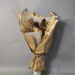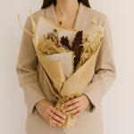 beige pampas grass - 1 pcs dried protea flower - 1 pcs dried red millet sprays - 2 pcs dried poppy pods - 2 pcs branch of dried white honesty (lunaria) - 1 pcs dried corn leaves - 1 pcs preserved light beige moss - 1 pcs