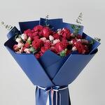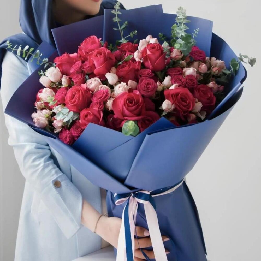 Sapphire – Luxury Red White Rose Bouquet Celebrate love, elegance, and special moments with Sapphire, a luxurious bouquet featuring 10 red roses, 20 red spray roses, 20 white spray roses, and 10 fresh eucalyptus stems. Wrapped in sapphire blue paper with a matching ribbon, this bouquet adds sophistication and romance to every occasion. Why You’ll Love Sapphire: • Fresh and Handpicked: Roses and eucalyptus carefully selected for lasting beauty • Elegant Presentation: Luxury sapphire blue wrap with a matching ribbon • Perfect Gift For: Girlfriend, wife, husband, mother, or someone special • Ideal Occasions: Birthdays, anniversaries, romantic surprises, celebrations, or luxury gifting Care Tips: • Keep in a cool, shaded space • Refresh water daily to maintain freshness • Enjoy up to 7 days of vibrant roses and eucalyptus Enhance Your Gift: Add a luxury vase, balloons, or premium chocolates to make Sapphire unforgettable. Majd Flowers Note: “Sapphire brings elegance, romance, and the beauty of handpicked roses to life’s special moments.” Rose bouquet