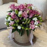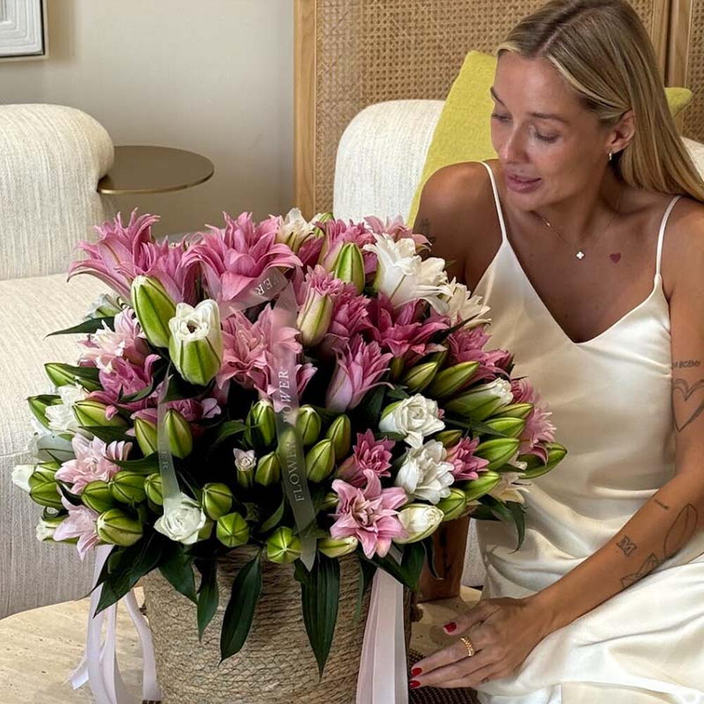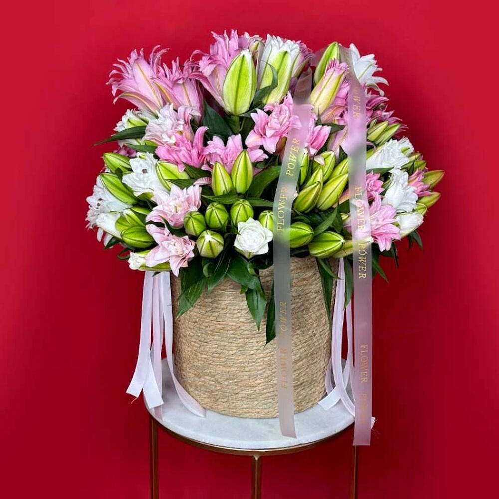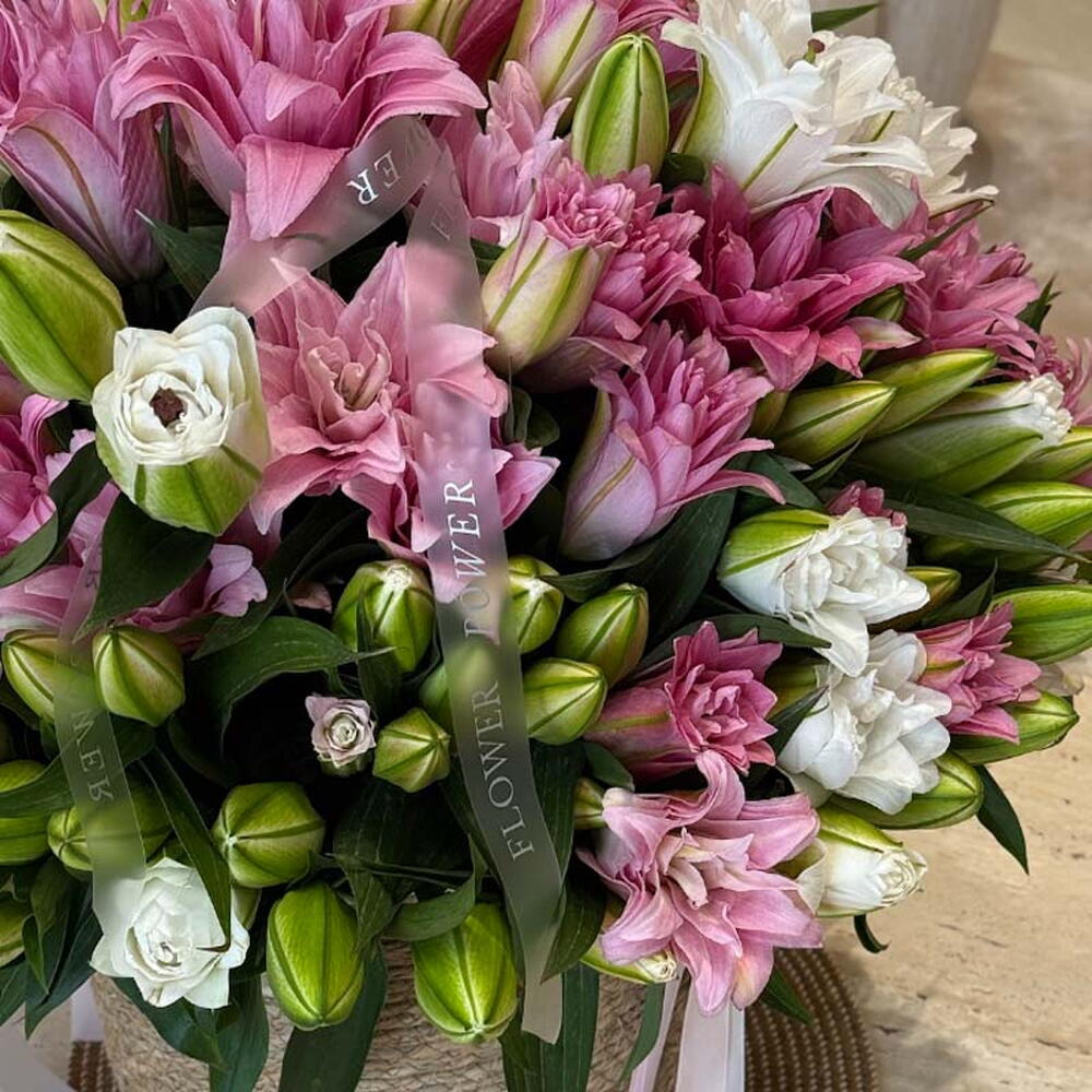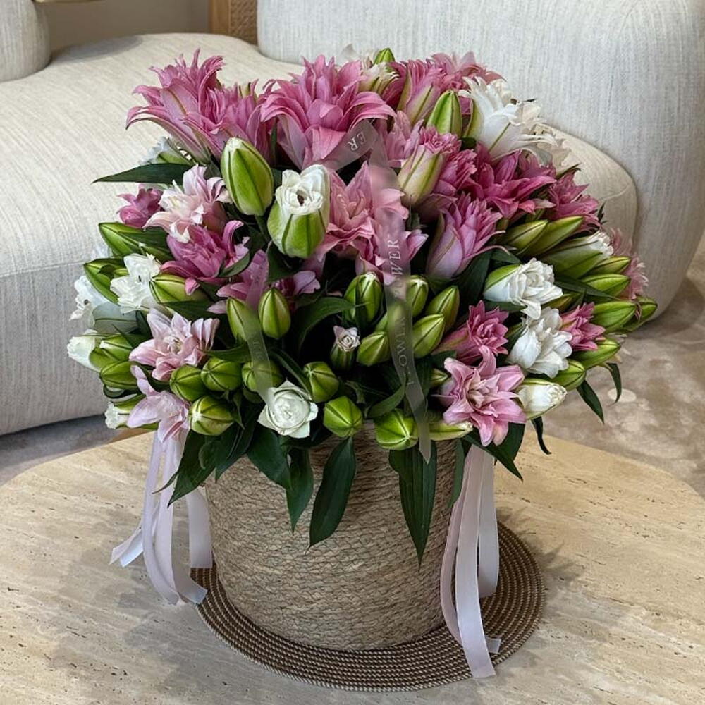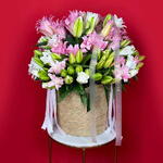 A luxurious and radiant arrangement of soft pink and ivory lilies, meticulously crafted to convey pure serenity and grace. Presented in a handcrafted rope-textured basket with satin ribbon accents, this Satin Bloom bouquet is the ideal gift for birthdays, new beginnings, or adding an element of timeless elegance to any luxury home or reception. Large Size - 60 Lilies