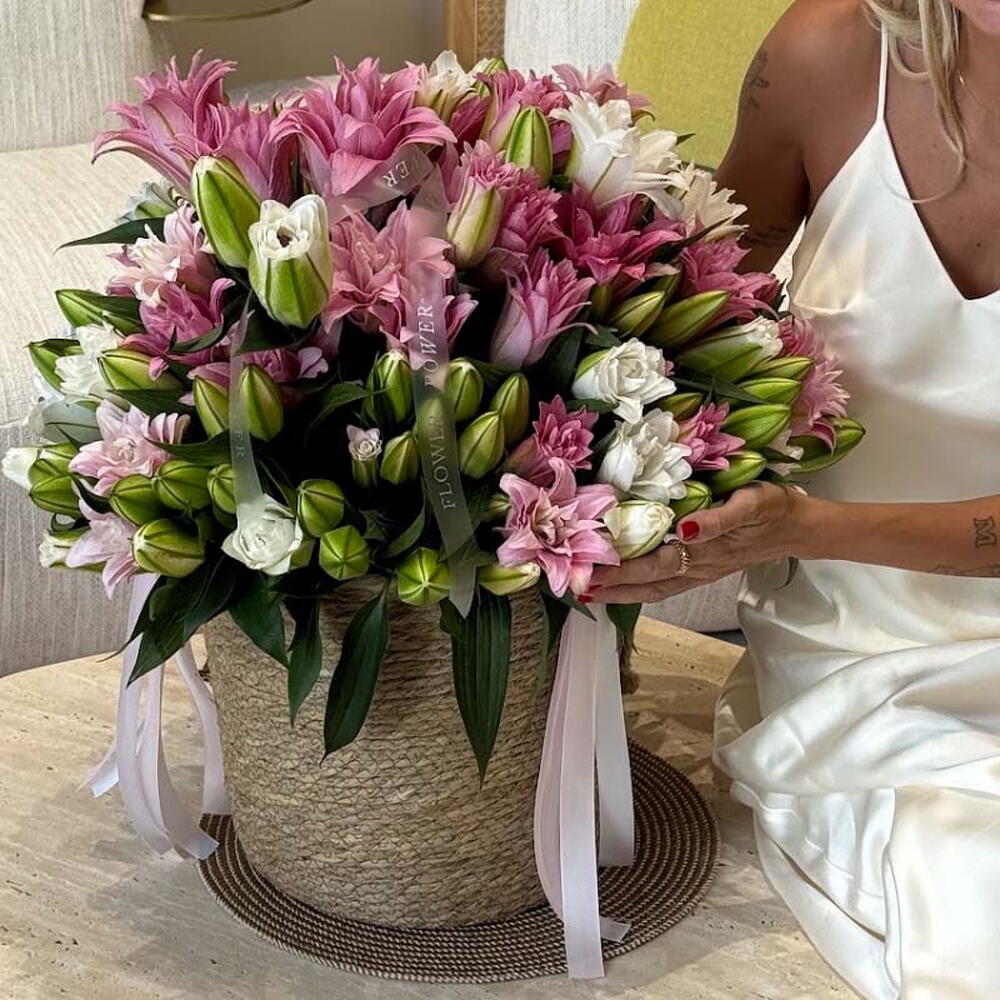 Satin Bloom: Basket of 60 White and Pink Lilies