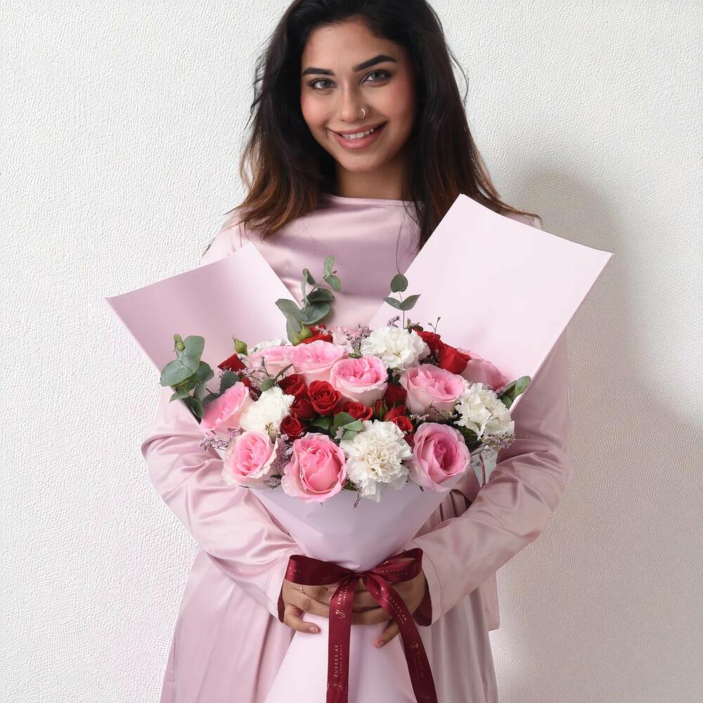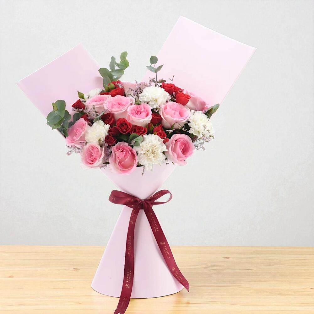 Graceful, vibrant, and thoughtfully curated, the Scarlet Blush Bouquet is a celebration of timeless love and warm affection. Featuring a stunning medley of pinks, reds, and whites, this bouquet evokes an aura of charm and emotion — beautifully hand-wrapped and tied with an elegant ribbon for a luxurious finish.
