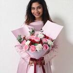 white carnations - 5 pcs pink limonium - 3 pcs ruscus stems - 10 pcs red spray roses - 6 pcs mandela pink roses - 10 pcs eucalyptus stems: - 5 pcs