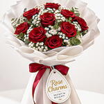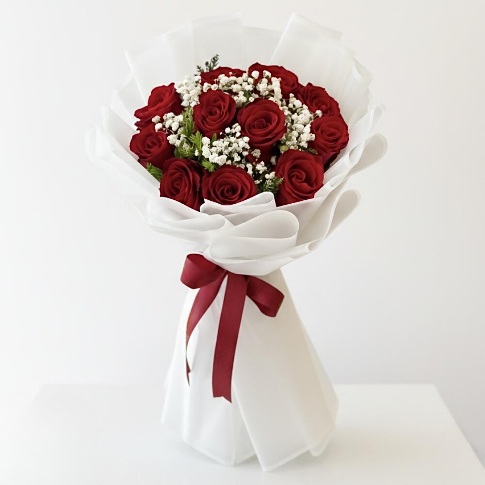 Eleven radiant red roses surrounded by delicate gypsophila, creating a soft and romantic cloud-like effect. A beautiful blend of passion and purity.