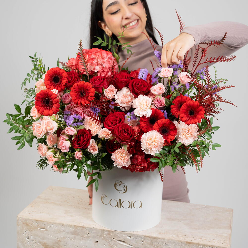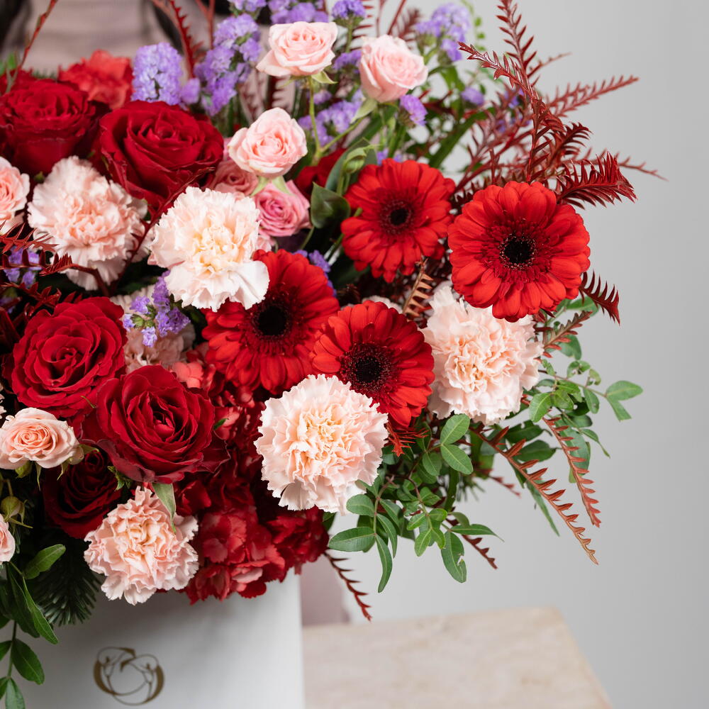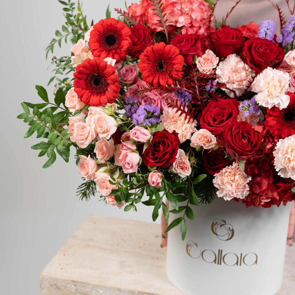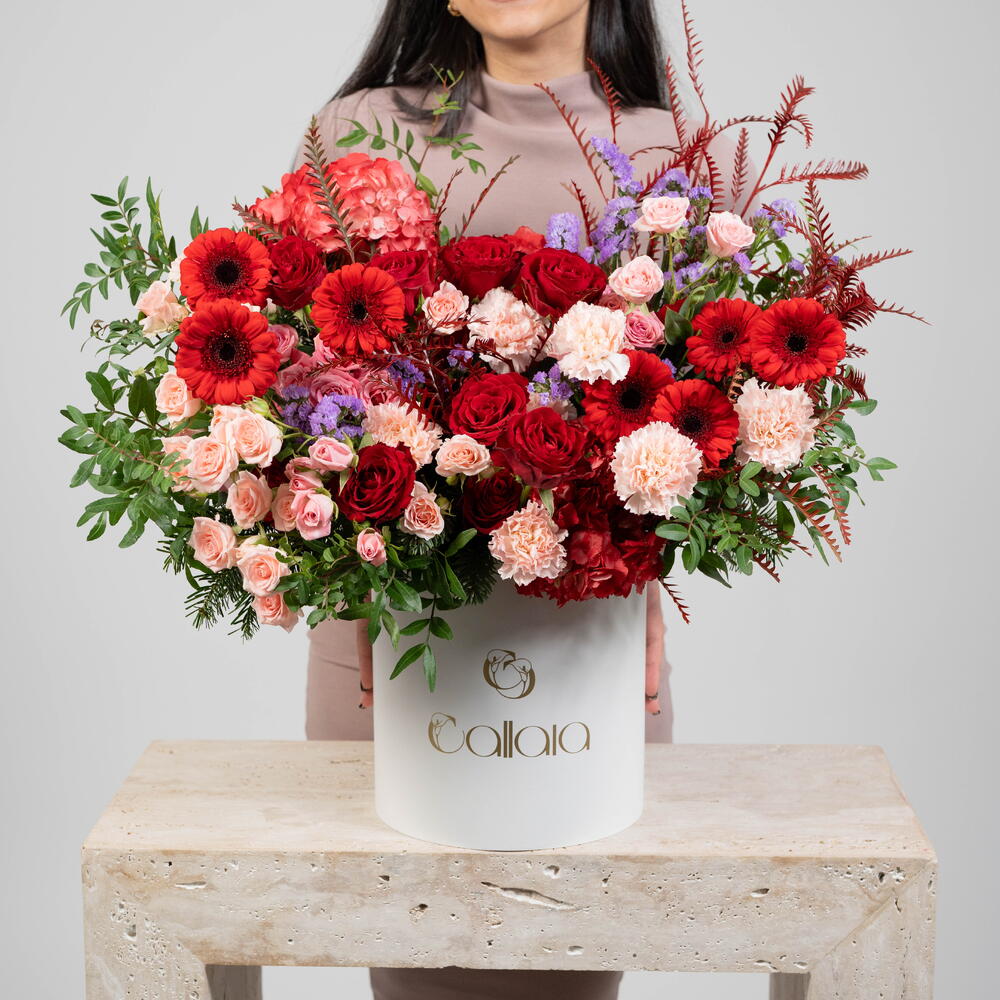 Feast your eyes on this striking arrangement of Flowers in a Box. Bursting with vibrant colors and an array of textures, this arrangement includes 7 beautiful red gerberas, 6 amethyst-washed statice, and 2 lush red hydrangeas. Embellished with 12 elegant red roses, 4 crisp pistacia leaves and 10 sophisticated Sahara spray roses, this selection is simply irresistible. Adding a touch of delicacy are 8 light pink carnations, accompanied by 7 spleen-whorled gravilla leaves. This display provides a feast for the senses with its harmonious mix of colors, forms, and delicate fragrances. Upgrade your space or surprise a loved one with this charming array of blooms.
