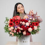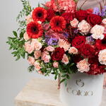 gerbera red - 7 pcs statice purple - 6 pcs hydrangea red - 2 pcs red roses - 12 pcs pistacia leaves - 4 pcs spray rose sahara - 10 pcs carnation light pink - 8 pcs gravilla leves - 7 pcs