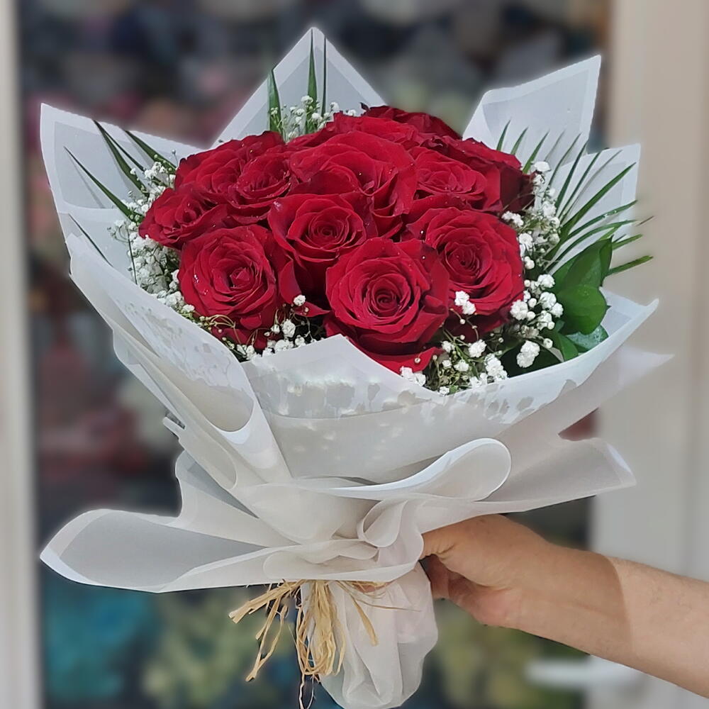 Passionate and timeless, the Scarlet Devotion bouquet showcases 15 velvety red roses embraced by lush greenery and two full stems of delicate gypsophila. The contrast of bold crimson and airy white creates a striking display of romance and elegance, making this bouquet a classic choice for love, celebration, and heartfelt moments. 🌹 Premium 15-stem red rose bouquet 🌹 Accented with lush greenery big gypsophila stems 🌹 Hand-wrapped with elegant ribbon finish 🌹 Same-day Express delivery available in Dubai Order now and let the fiery beauty of red roses express the deepest emotions.