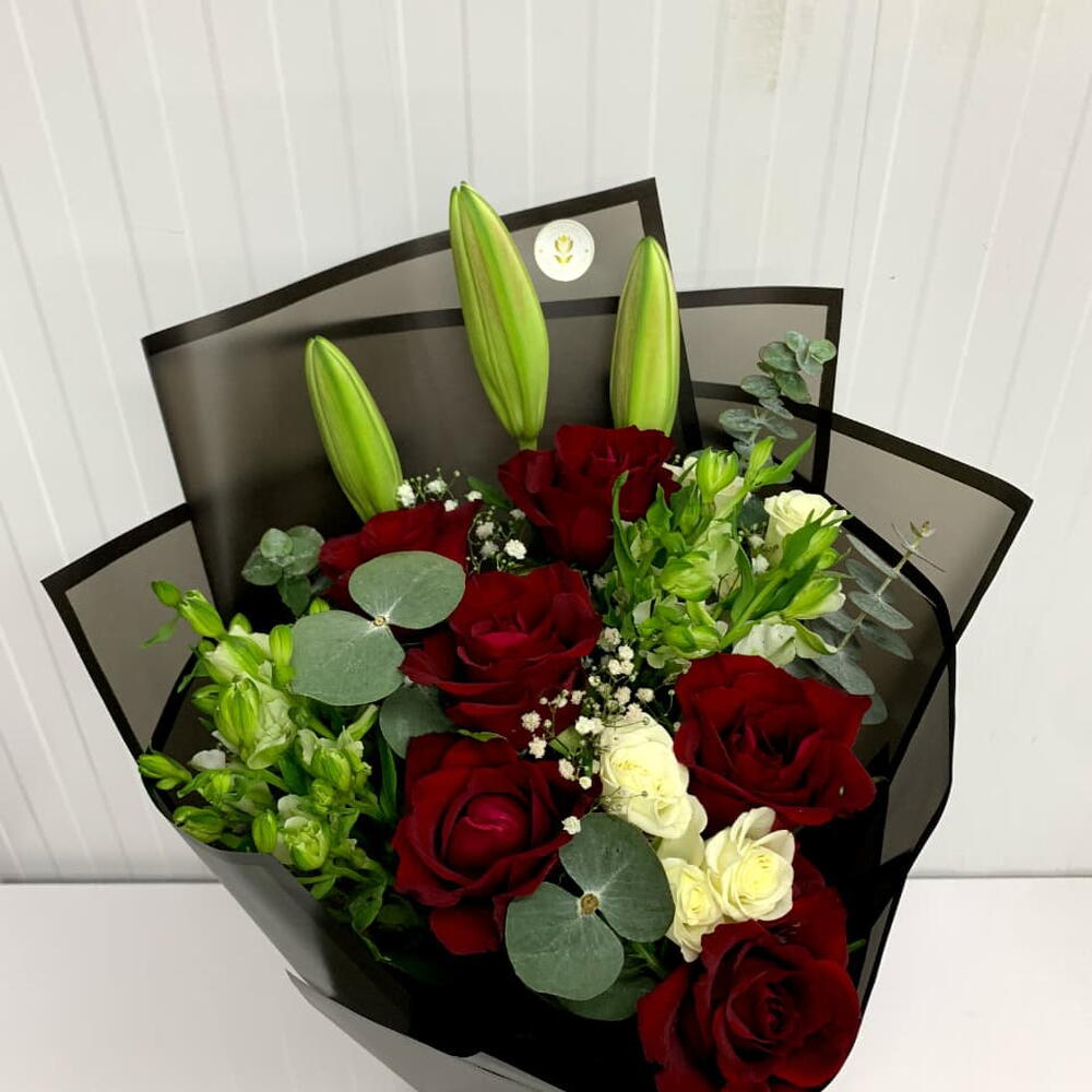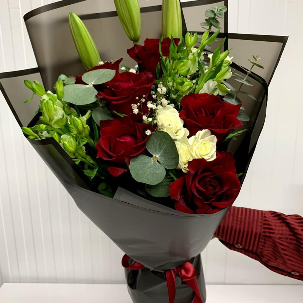 Red rose - 6 pcs alstroemeria white - 2 pcs lily white - 1 pcs wrapping paper - 4 pcs spray rose white - 2 pcs eucalyptus leaves - 4 pcs gypso - 3 pcs