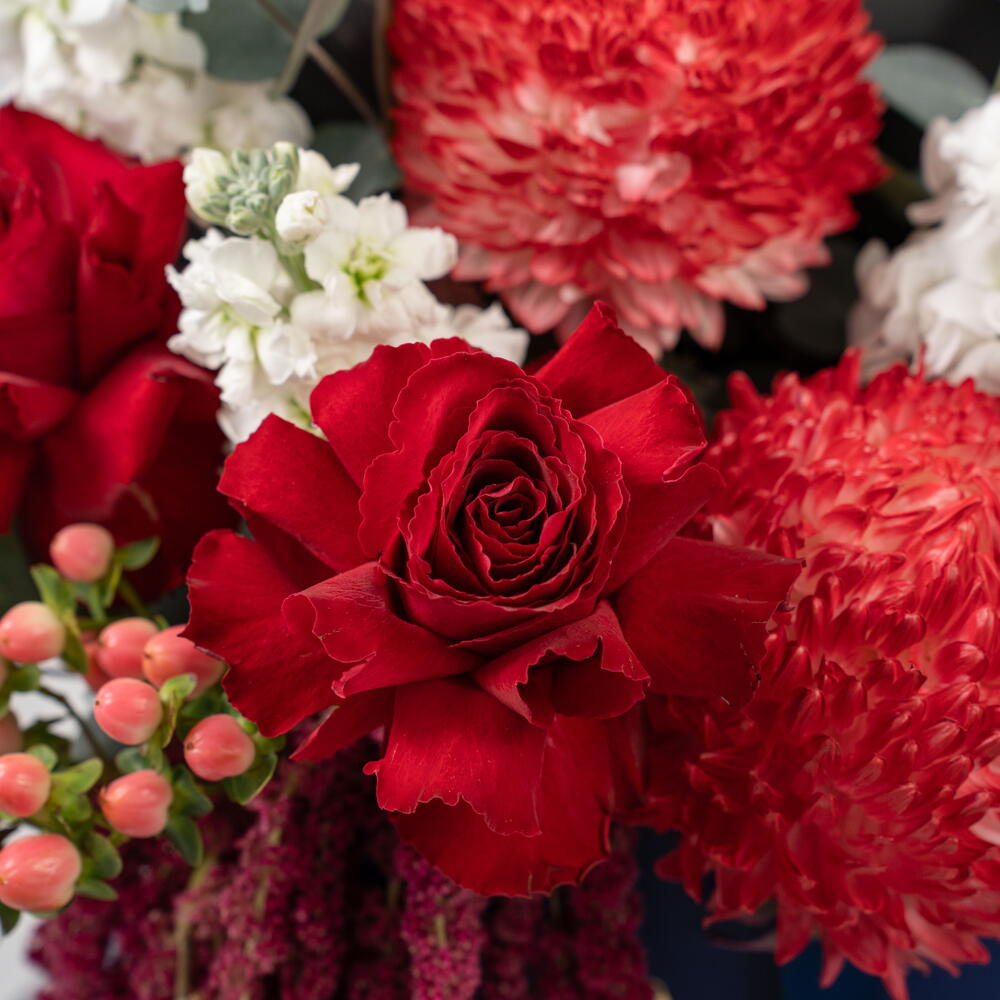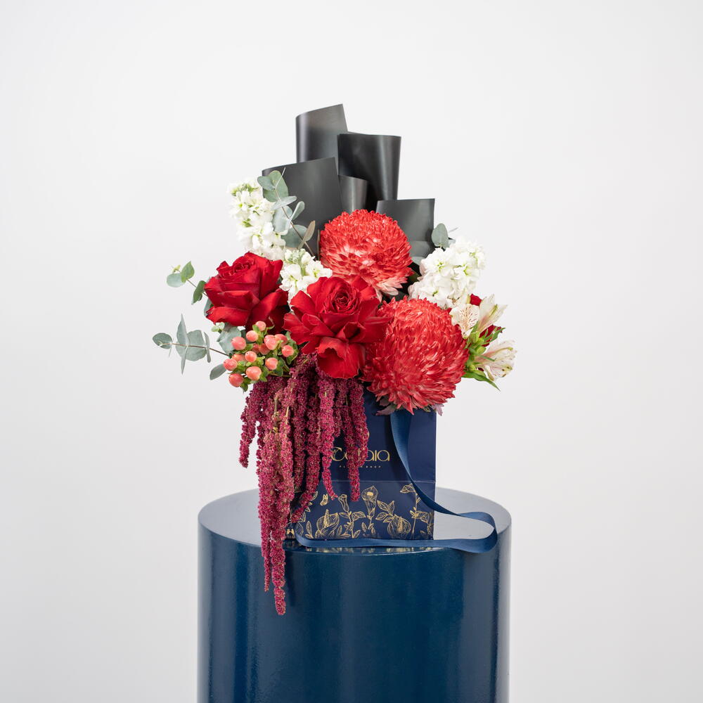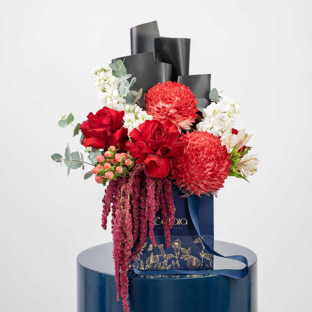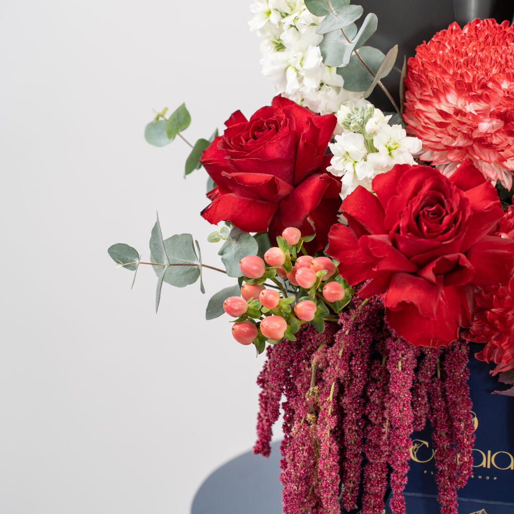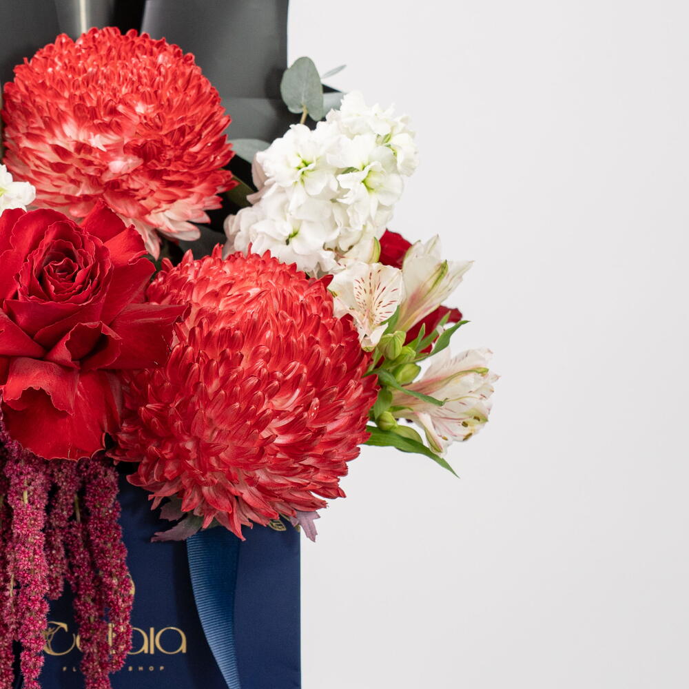 Scarlet Majesty — a bold celebration of elegance and power. A modern-designed arrangement featuring premium red roses, vibrant pincushion proteas, lush amaranthus, white blooms, and fresh eucalyptus, all styled in Callaia’s signature navy box. Perfect for celebrations, grand gestures, and moments that deserve unforgettable beauty. Callaia – Every Moment Matters.