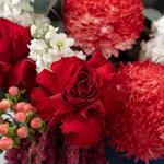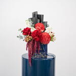 Red rose - 3 pcs Eucalyptus - 2 pcs Alstroemeria - 1 pcs hypericum - 2 pcs matthiola - 3 pcs amaranthus - 1 pcs chrysamthemum peonies red - 2 pcs
