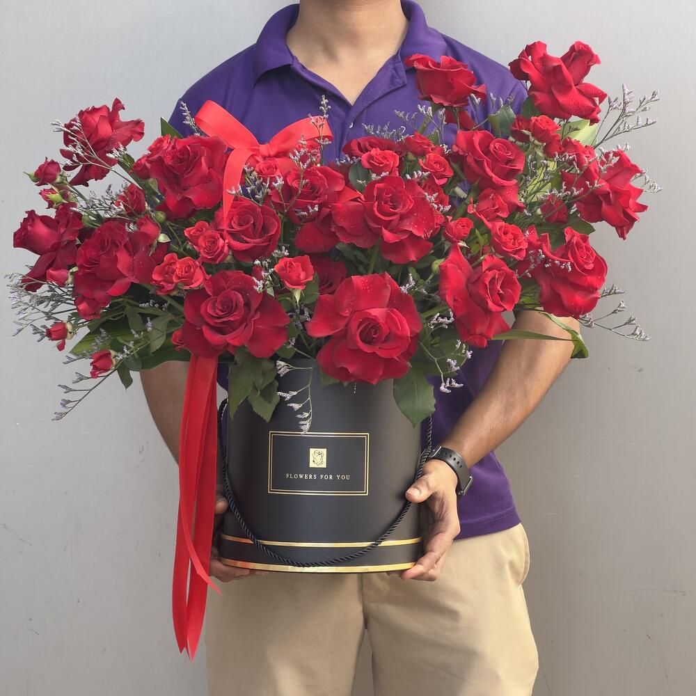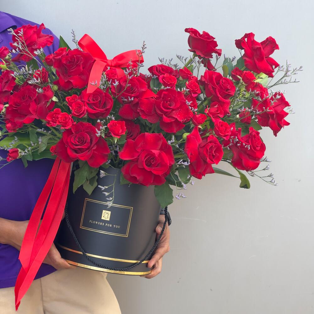 ignite passion with the Timeless Love Rose Box — a breathtaking floral arrangement featuring 21 radiant red roses and 6 vibrant red spray roses, beautifully presented in a luxurious box and finished with an elegant ribbon. Each bloom speaks the universal language of love, devotion, and heartfelt emotion, making this ensemble a perfect choice for anniversaries, proposals, birthdays, or Valentine’s Day. Designed for modern romantics who appreciate bold beauty and classic elegance, this floral gift is sure to leave a lasting impression. ✔️ Premium fresh-cut roses ✔️ Luxurious keepsake box with ribbon detailing ✔️ Same-day delivery available in Dubai Order now and speak your heart with flowers that say it all.