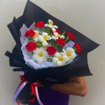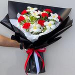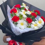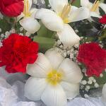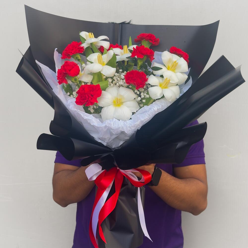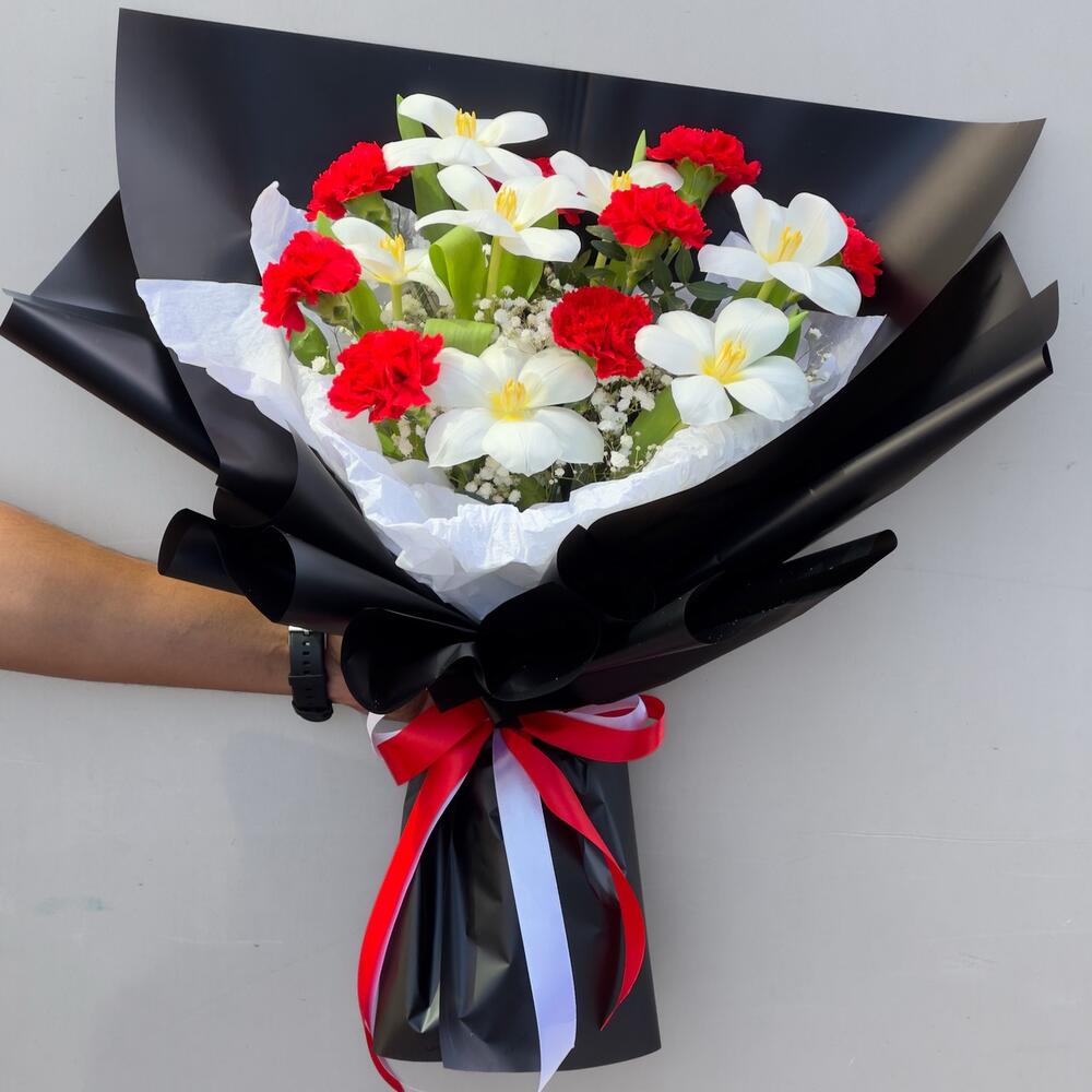 A striking bouquet of 7 stems graceful white tulips and vibrant 8 red carnations, blending elegance with passion. This timeless arrangement symbolizes purity, love, and admiration, making it a perfect gift for any heartfelt occasion.