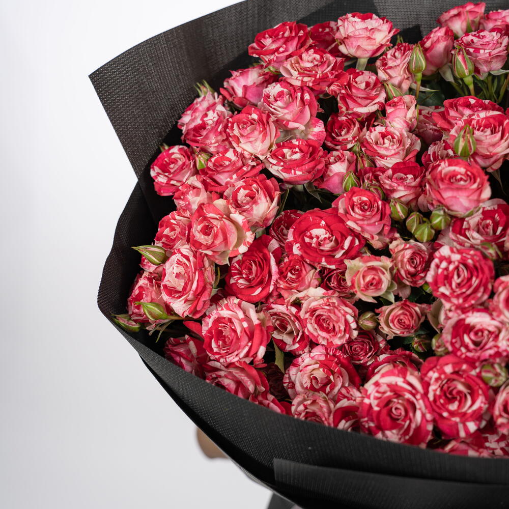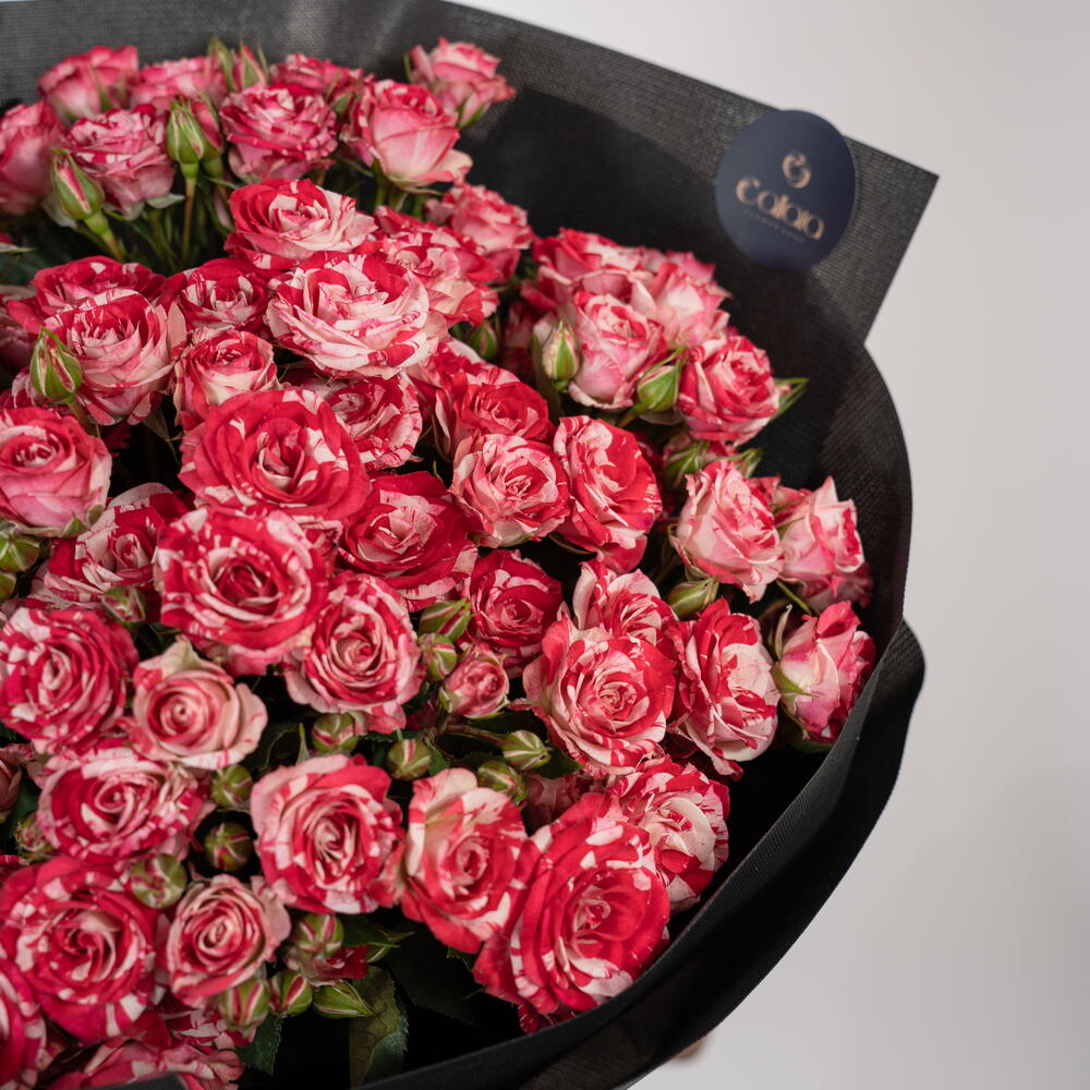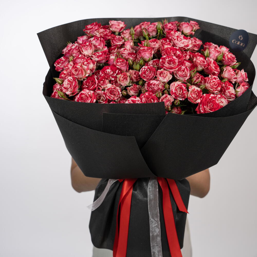 Introducing Scarlet Symphony, a striking bouquet crafted with dozens of fresh spray roses in vivid scarlet and soft blush tones. The blooms are tightly arranged to create a full, premium look, wrapped in our signature black paper and finished with statement red ribbons. This bouquet is ideal for: ❤️ Romantic gifting 🎉 Birthdays celebrations 🌹 Anniversary surprises 💐 Luxury flower lovers Every arrangement is prepared with Callaia’s signature attention to detail — elegant, bold, and unforgettable. Callaia – Every Moment Matters.
