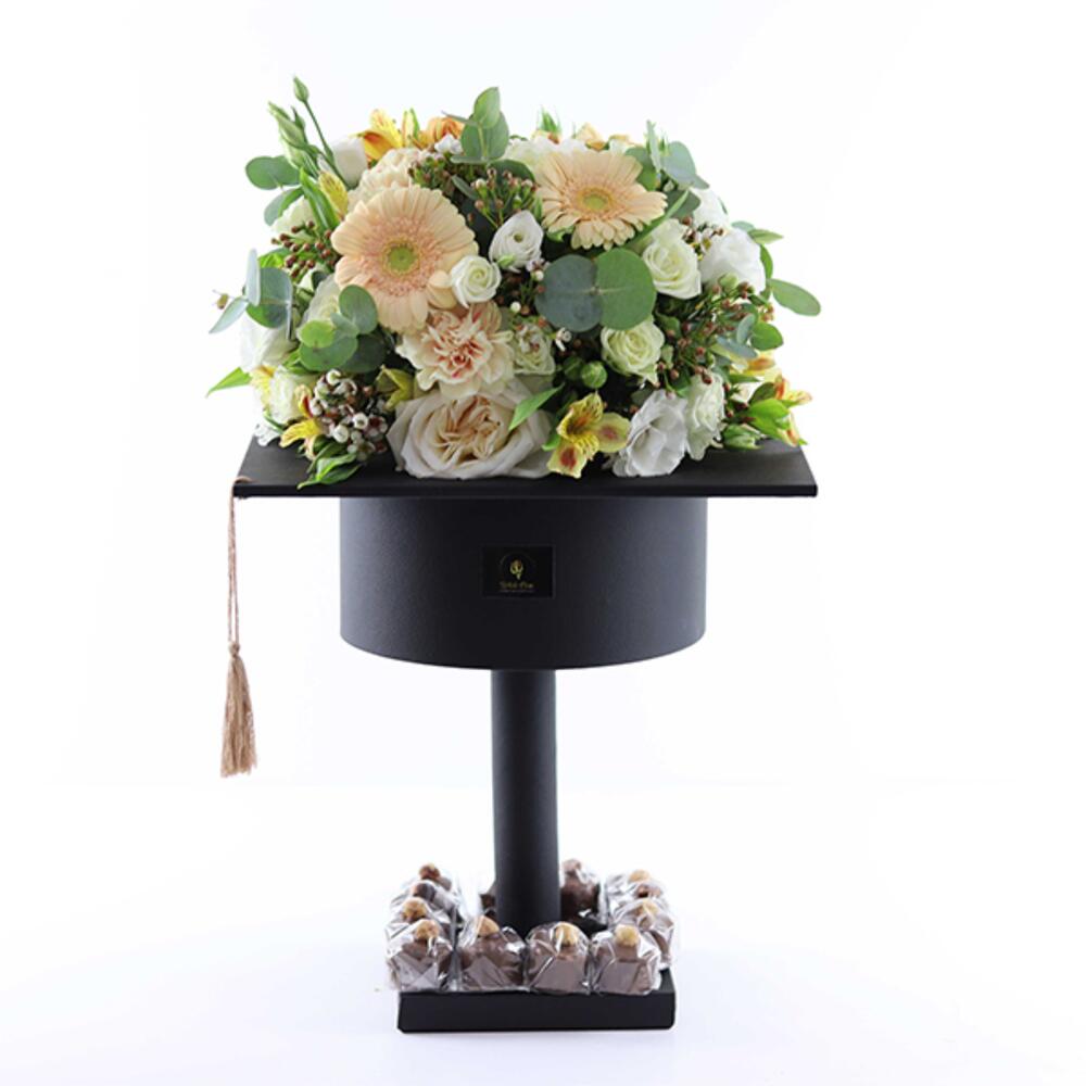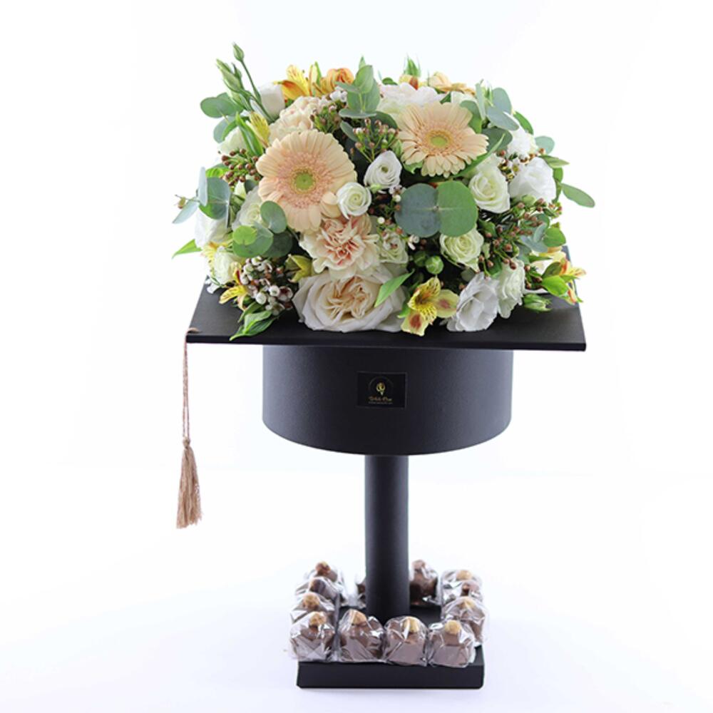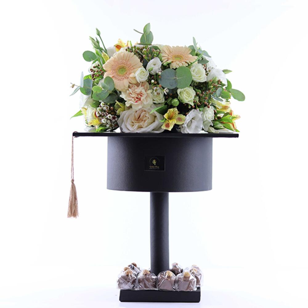 combination of Ohara , Baby roses, gerbera and other mix of flowers and 250g Chocolate arranged on a stand.