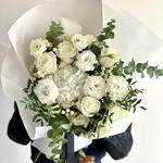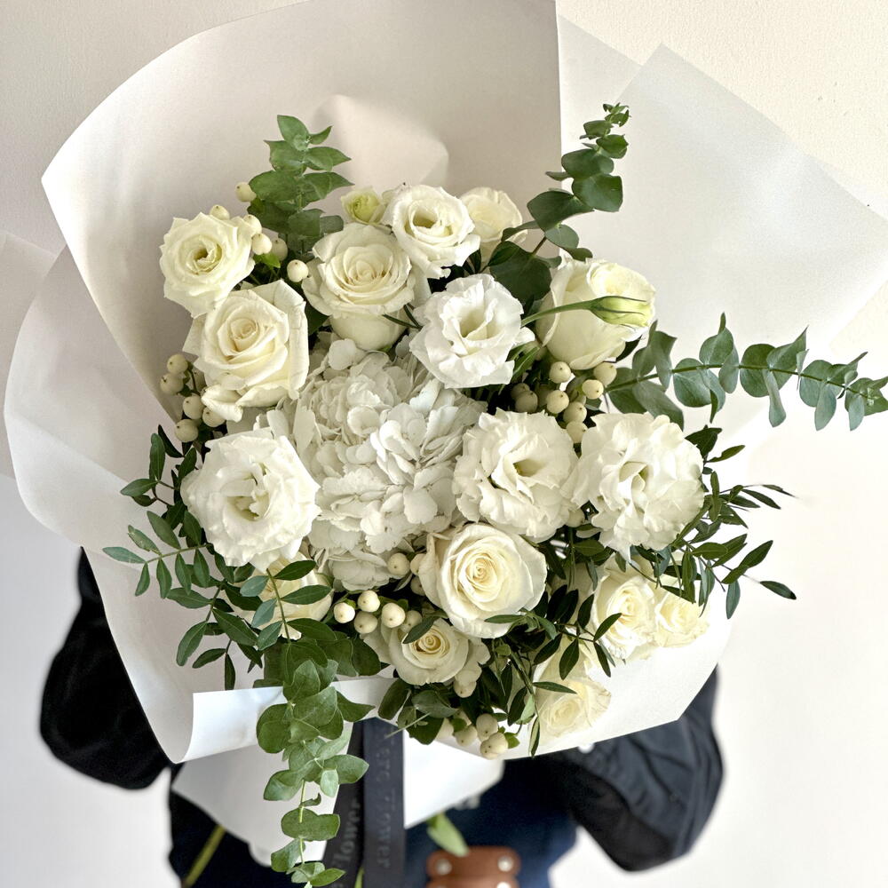 Pure elegance in every stem, this bouquet features the timeless beauty of white roses, pristine lisianthus, and soft, fluffy hydrangeas, creating a serene and sophisticated arrangement. White hypericum berries add a subtle texture, while pistacia and eucalyptus leaves lend a fresh, natural greenery to complete the look. This all-white bouquet evokes a sense of tranquility and purity, making it the perfect choice for weddings, anniversaries, or any occasion that calls for a touch of refined grace.