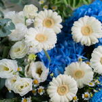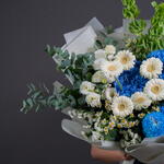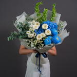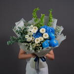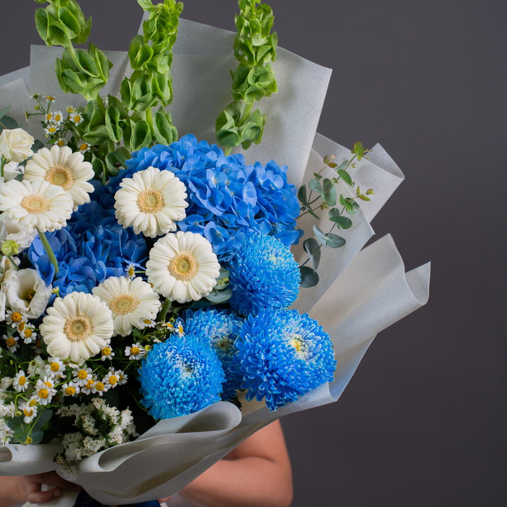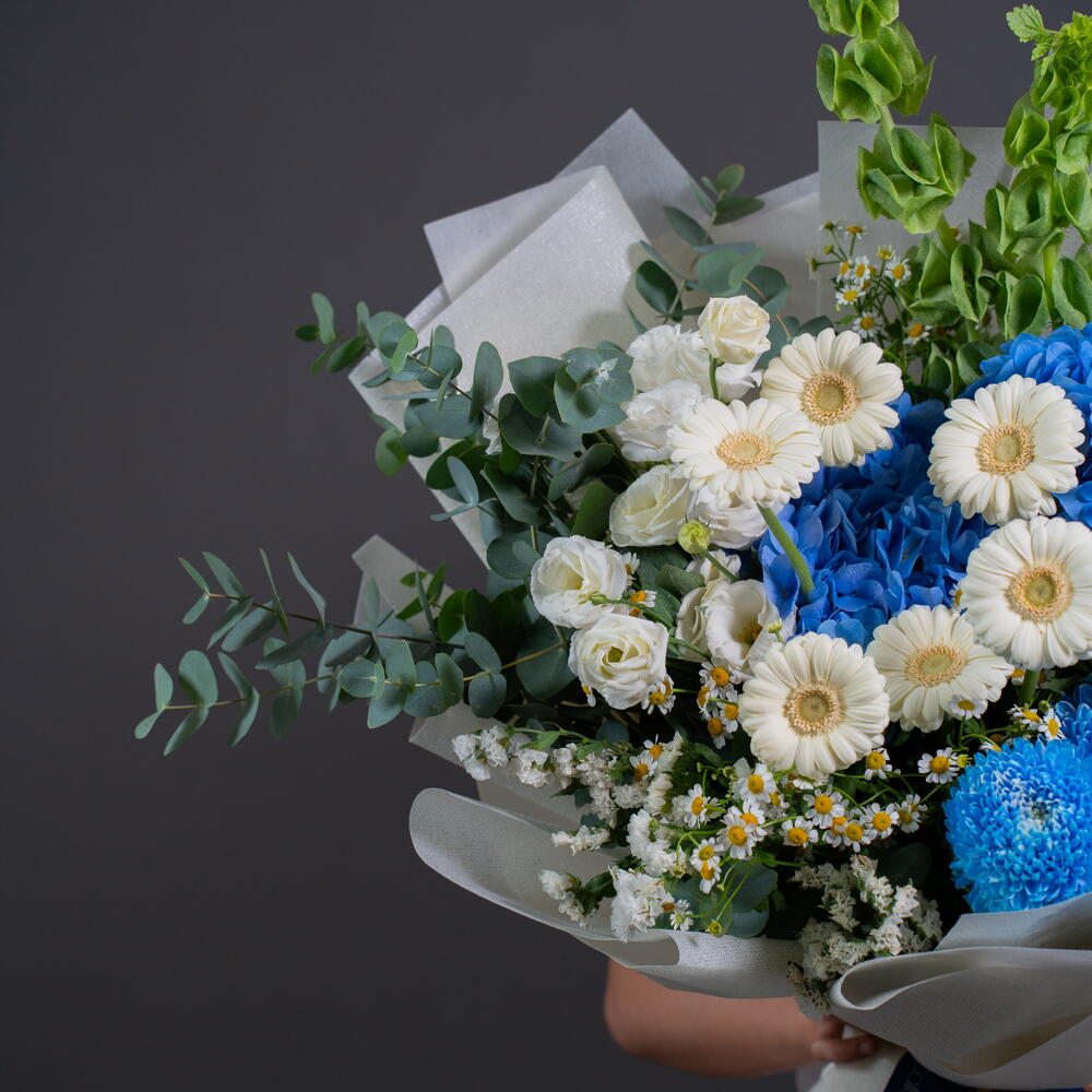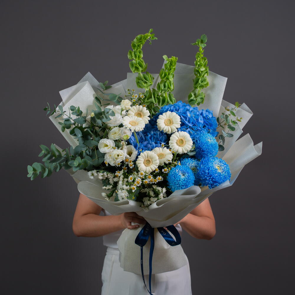 Eustoma white - 3 pcs tanacetum - 3 pcs hydrangea blue - 2 pcs statice white - 2 pcs germini white - 6 pcs molucella - 3 pcs